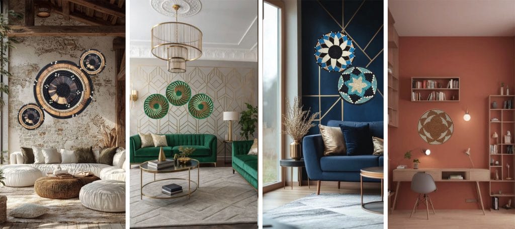 Let your walls speak. A curated arrangement of handmade pieces—like a collage of flat wall mats, baskets, and carved accents—can create a visual narrative that connects you to global traditions.