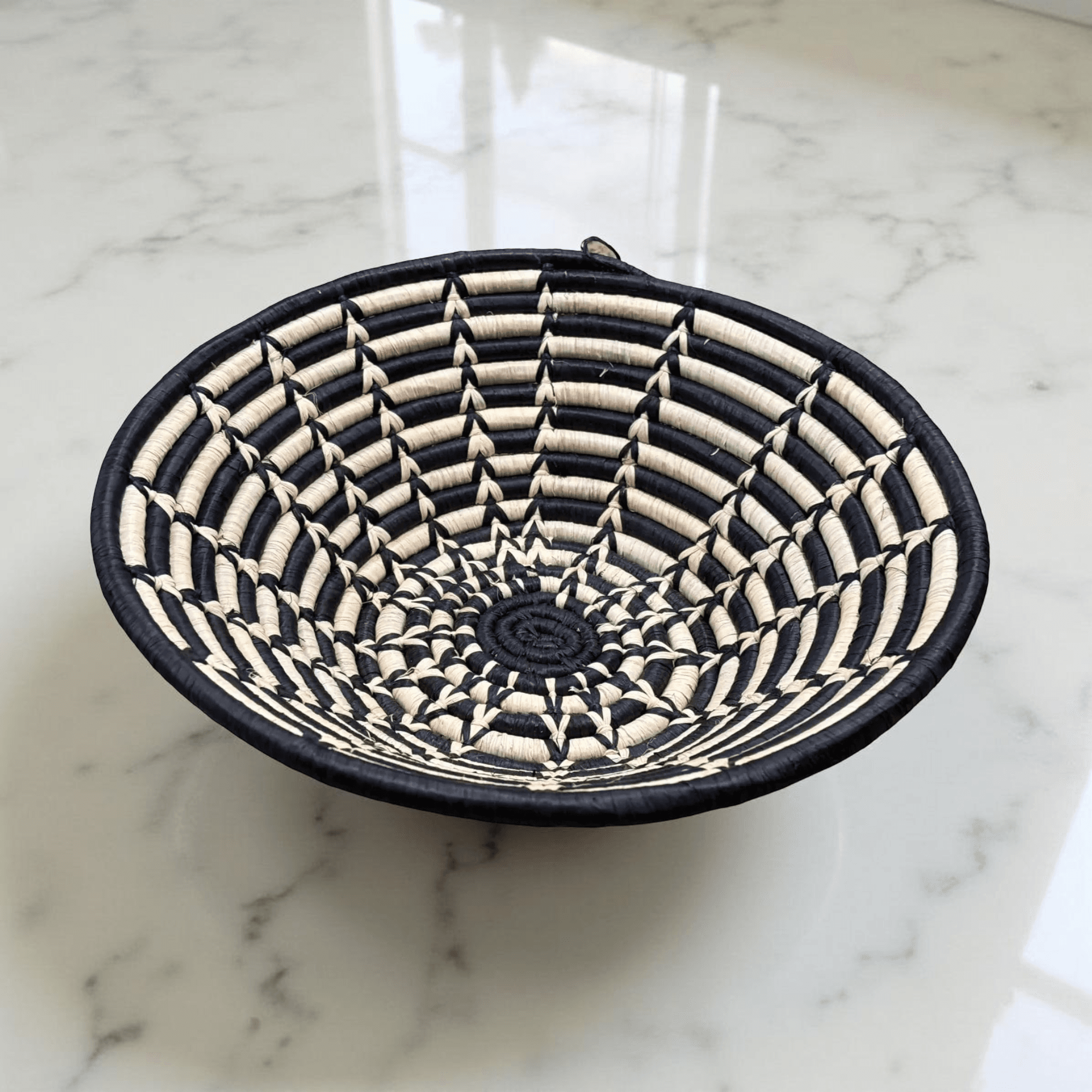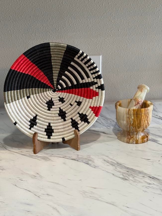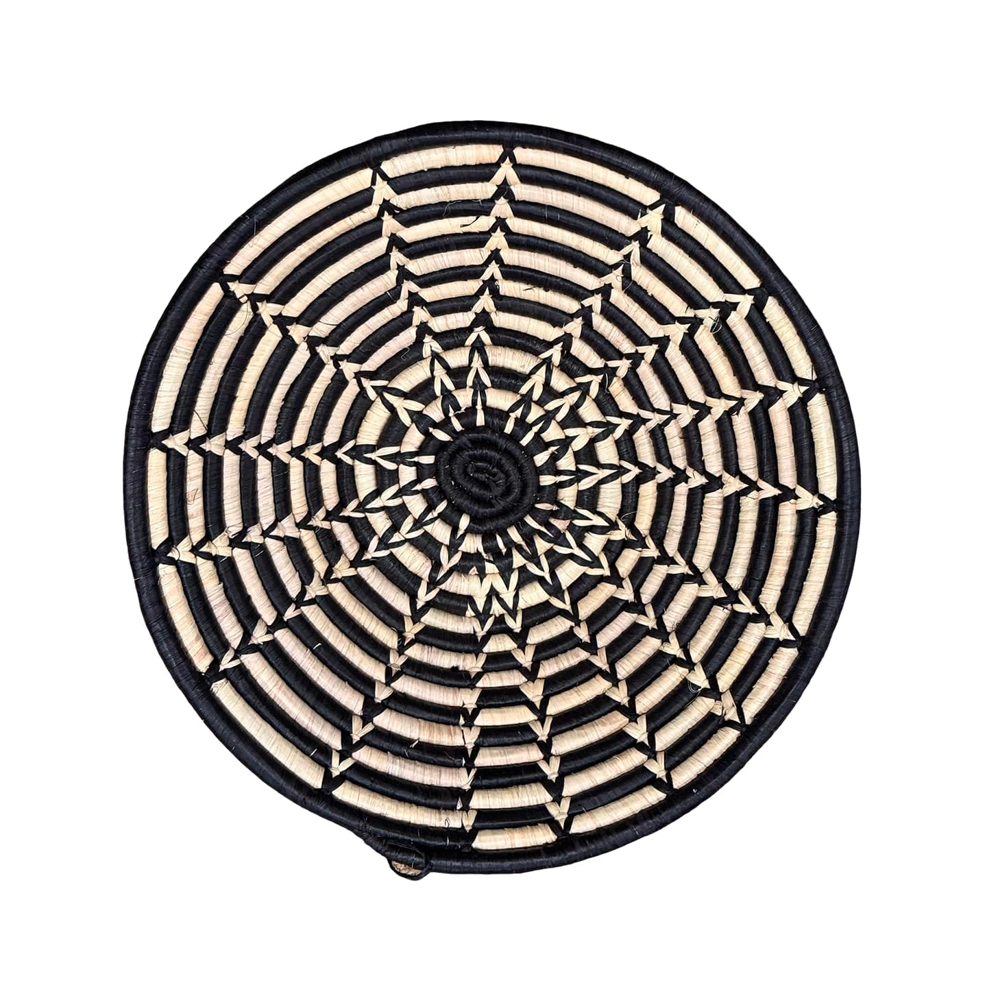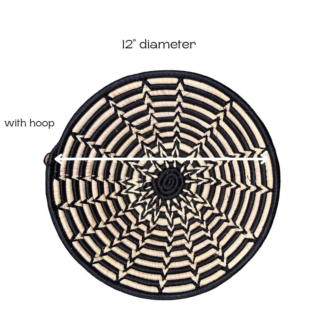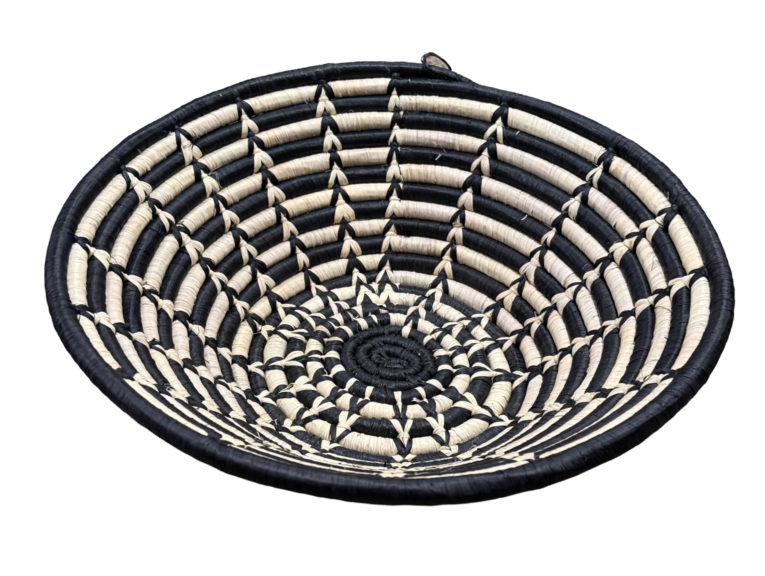 Elevate your home with this stunning Handwoven Raffia Wall Basket, a true work of art crafted by skilled artisans using traditional African weaving techniques. This round basket seamlessly blends functionality with aesthetic appeal, making it a perfect wall centerpiece, table decor, food storage basket or thoughtful gift. Each basket is meticulously woven from eco-friendly raffia and natural fibers, ensuring durability while maintaining a lightweight feel. These versatile handmade raffia baskets serve multiple purposes use them as hanging wall baskets to elevate your wall décor, as a handmade fruit bowl basket for functional beauty, or as a thoughtful gift that adds African elegance and warmth to any space. Woven raffia basket, eco-friendly, Fair Trade, approx. 12″ diameter x 3″ height.