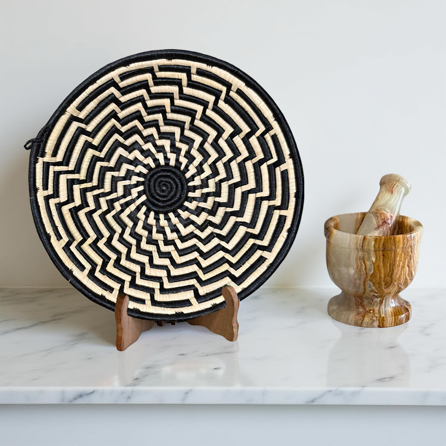 Elevate your home with this stunning Handwoven Raffia Wall Basket, a true work of art crafted by skilled artisans using traditional African weaving techniques. This round basket seamlessly blends functionality with aesthetic appeal, making it a perfect wall centerpiece, table decor, food storage basket or thoughtful gift. Each basket is meticulously woven from eco-friendly raffia and natural fibers, ensuring durability while maintaining a lightweight feel. These versatile handmade raffia baskets serve multiple purposes use them as hanging wall baskets to elevate your wall décor, as a handmade fruit bowl basket for functional beauty, or as a thoughtful gift that adds African elegance and warmth to any space. Woven raffia basket, eco-friendly, Fair Trade, approx. 12″ diameter x 3″ height.