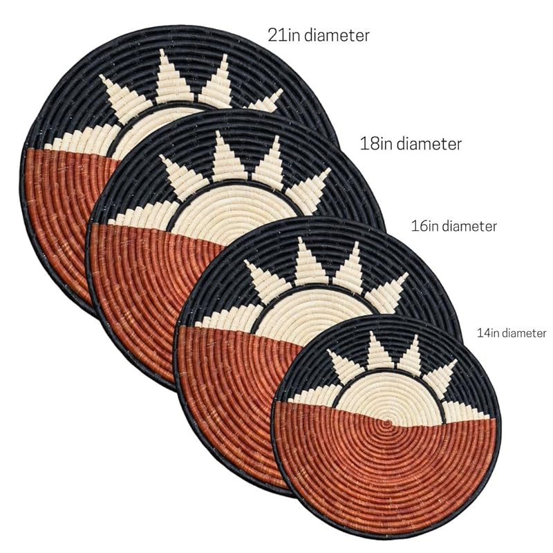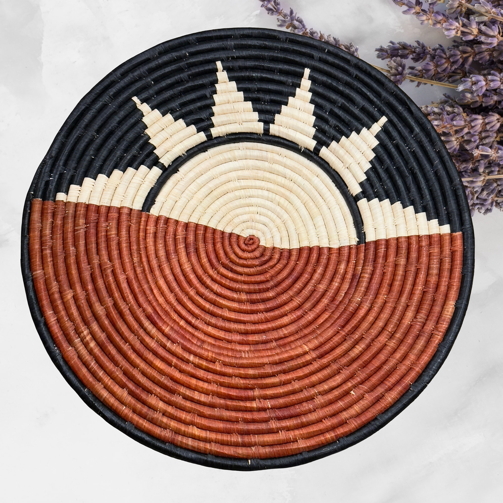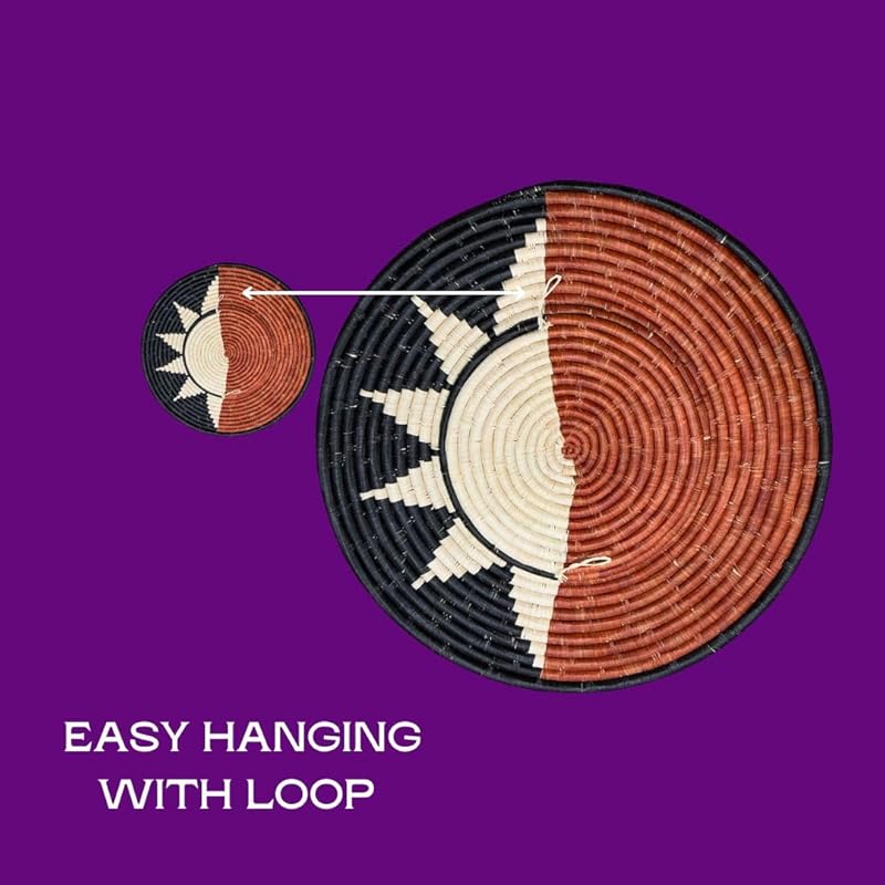Handwoven Raffia Wall Plate Basket: Versatile Boho Home Decor Piece in Black Swirl Plate Mat – 3 size options