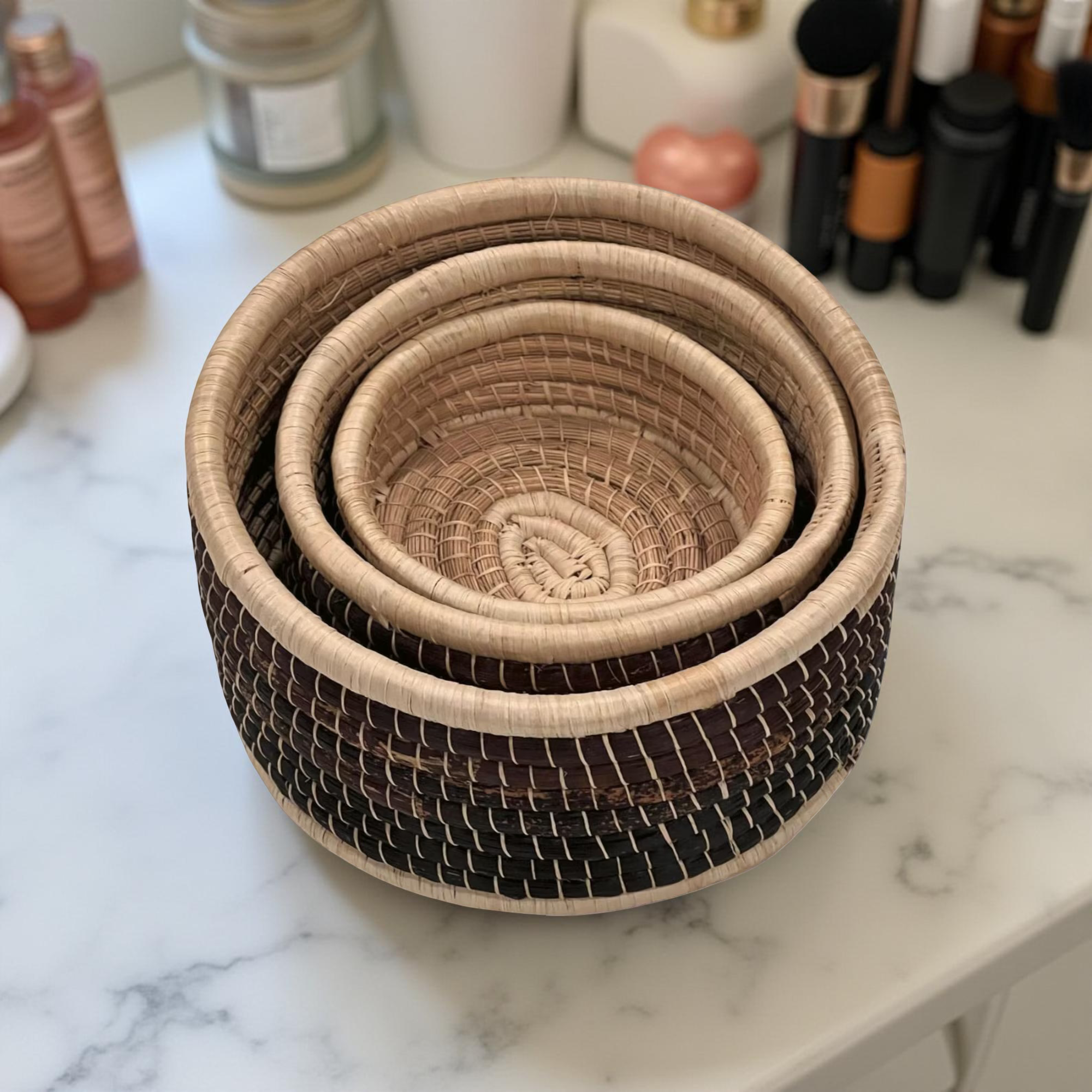 Elevate your home decor with these beautifully handcrafted, nesting baskets. Expertly woven from natural raffia, each basket showcases intricate patterns and a warm, earthy tone. This set of three nesting sizes offers endless possibilities, from organizing small items to creating stylish centerpieces. Whether you prefer the vibrant hues of the red-trimmed basket, the classic elegance of the brown set, or the warm tones of the natural basket, these versatile pieces are sure to complement any style. Embrace sustainability and add a touch of nature to your living space with these exquisite, artisanal baskets.
