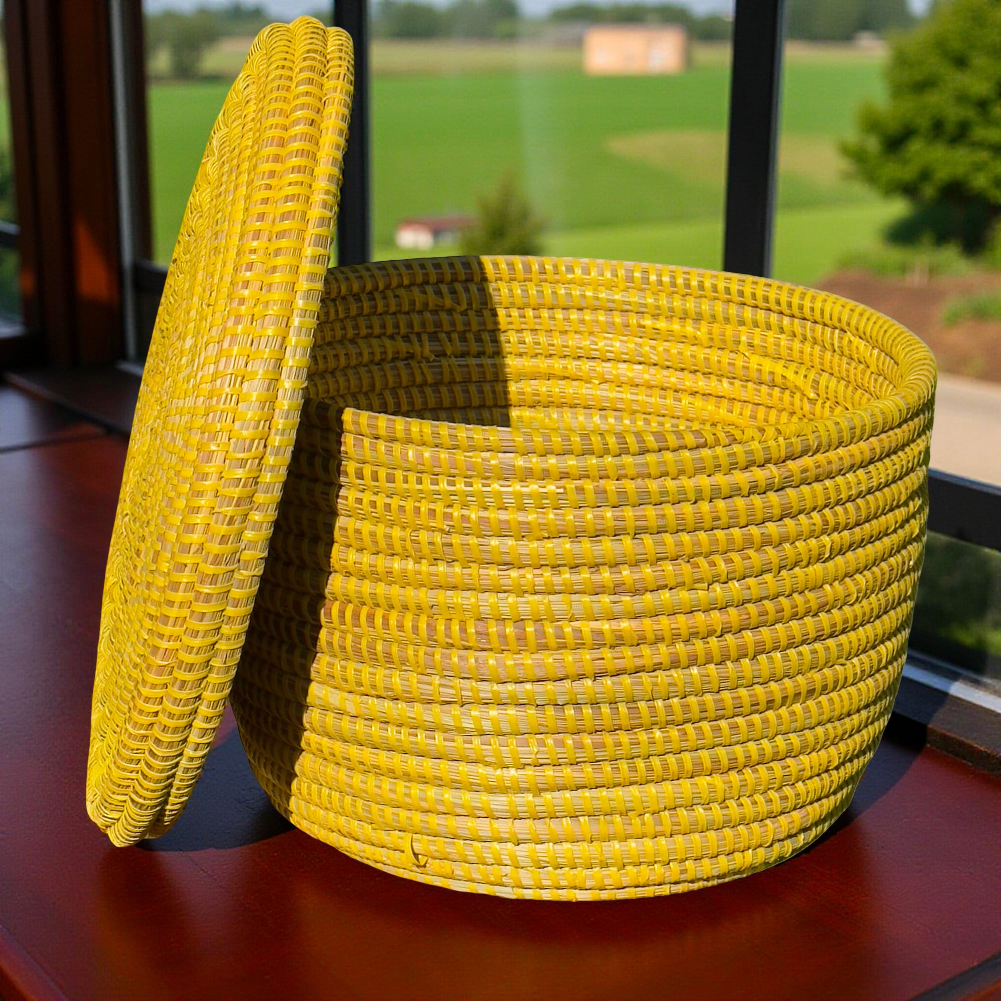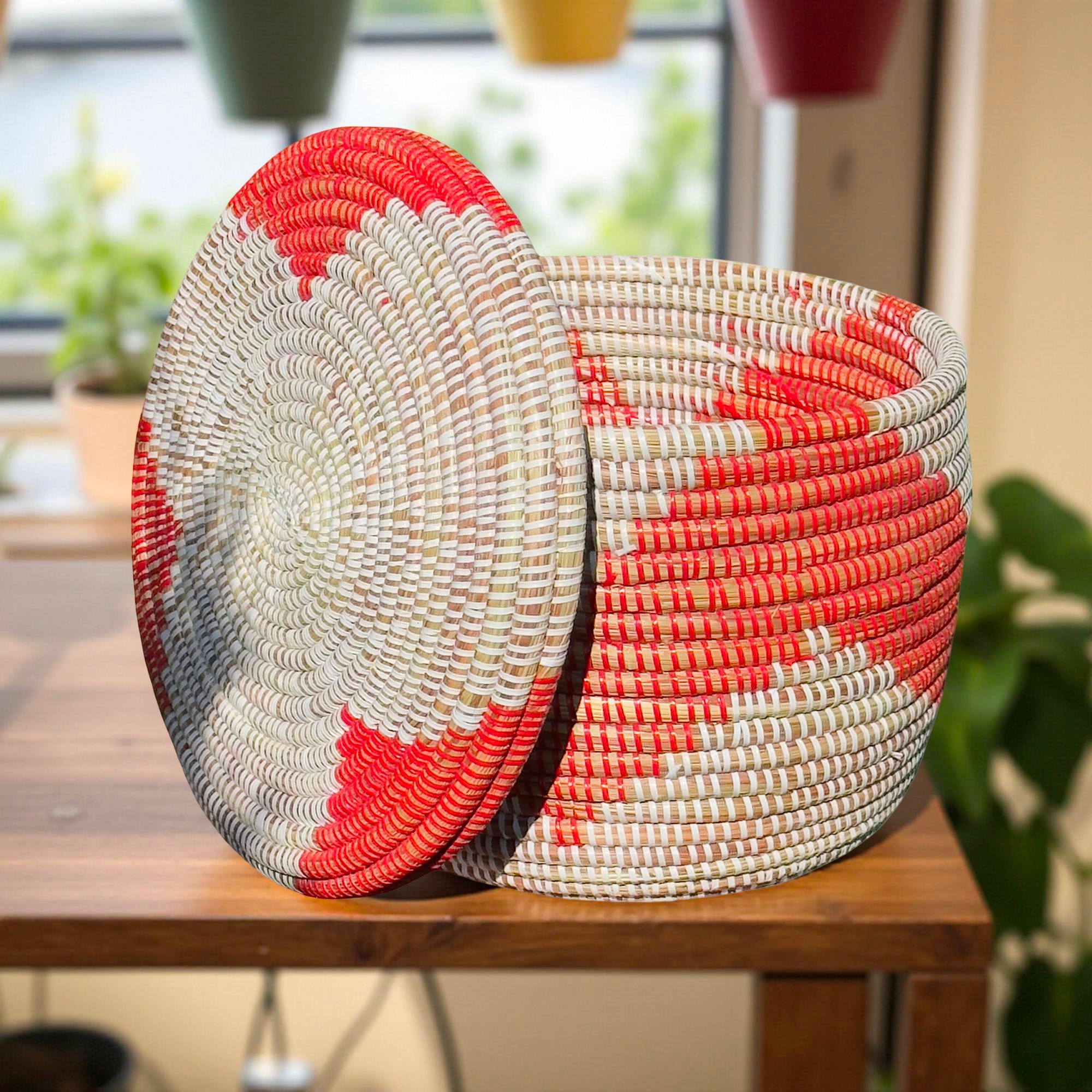 This exquisite lidded storage basket, handcrafted in Senegal, brings a touch of vibrant artistry and sustainable design to your home. Skillfully woven from natural rice straw and colorful repurposed plastic strips, each basket tells a story of tradition and resourcefulness. The intricate weaving patterns showcase the artisan's expertise, creating a visually captivating piece with a rich, textured feel.