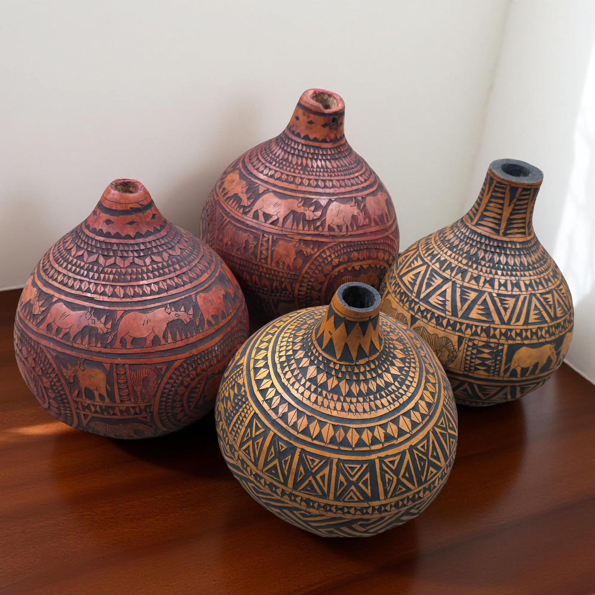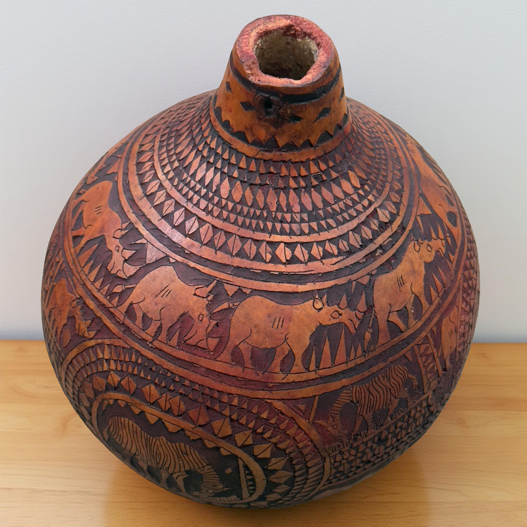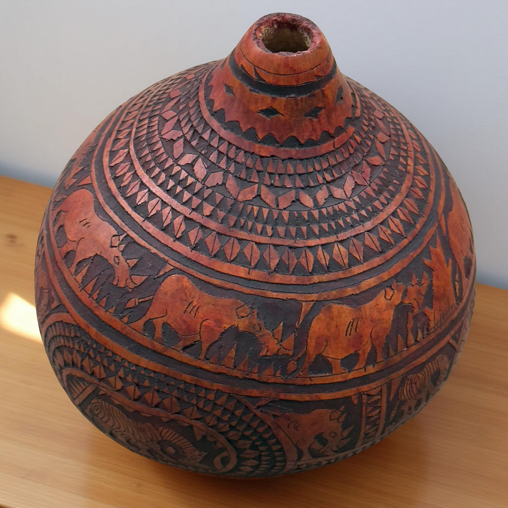 Handcarved African Calabash Gourds with Safari Animal Scenes and Symbolic Cultural Patterns – Various Sizes