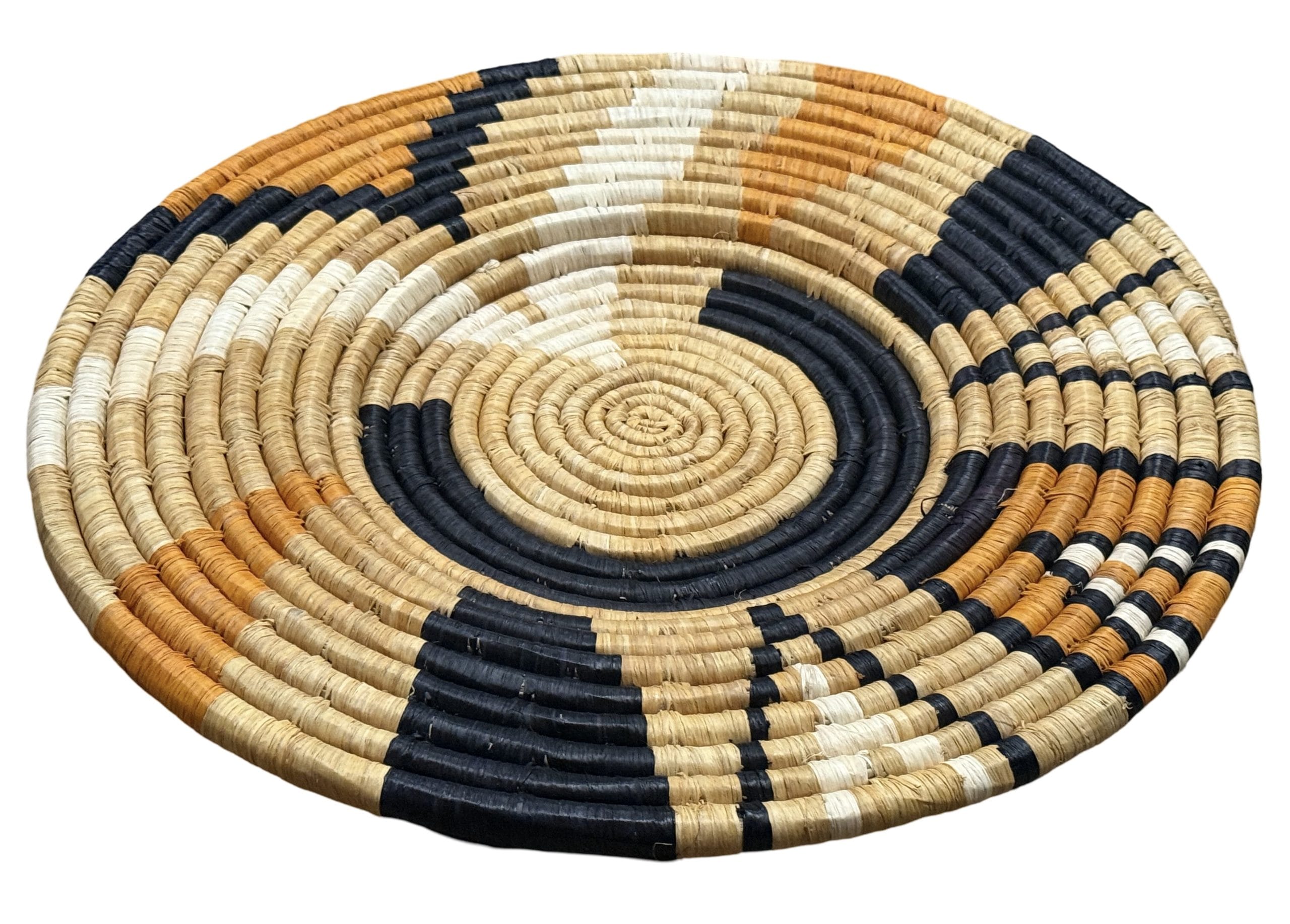 This plate shaped raffia mat measures approx 18″, 16″, 14″ in diameter