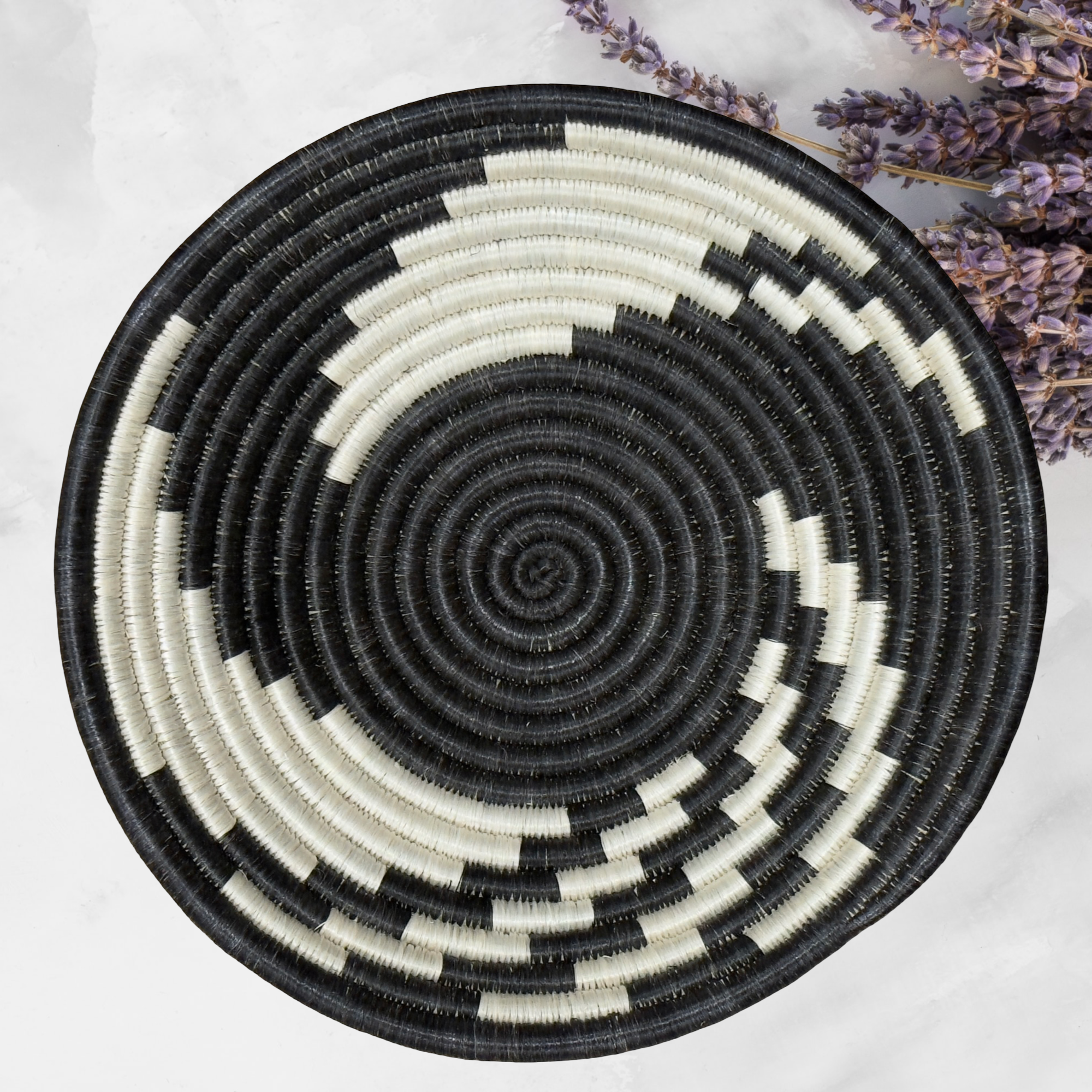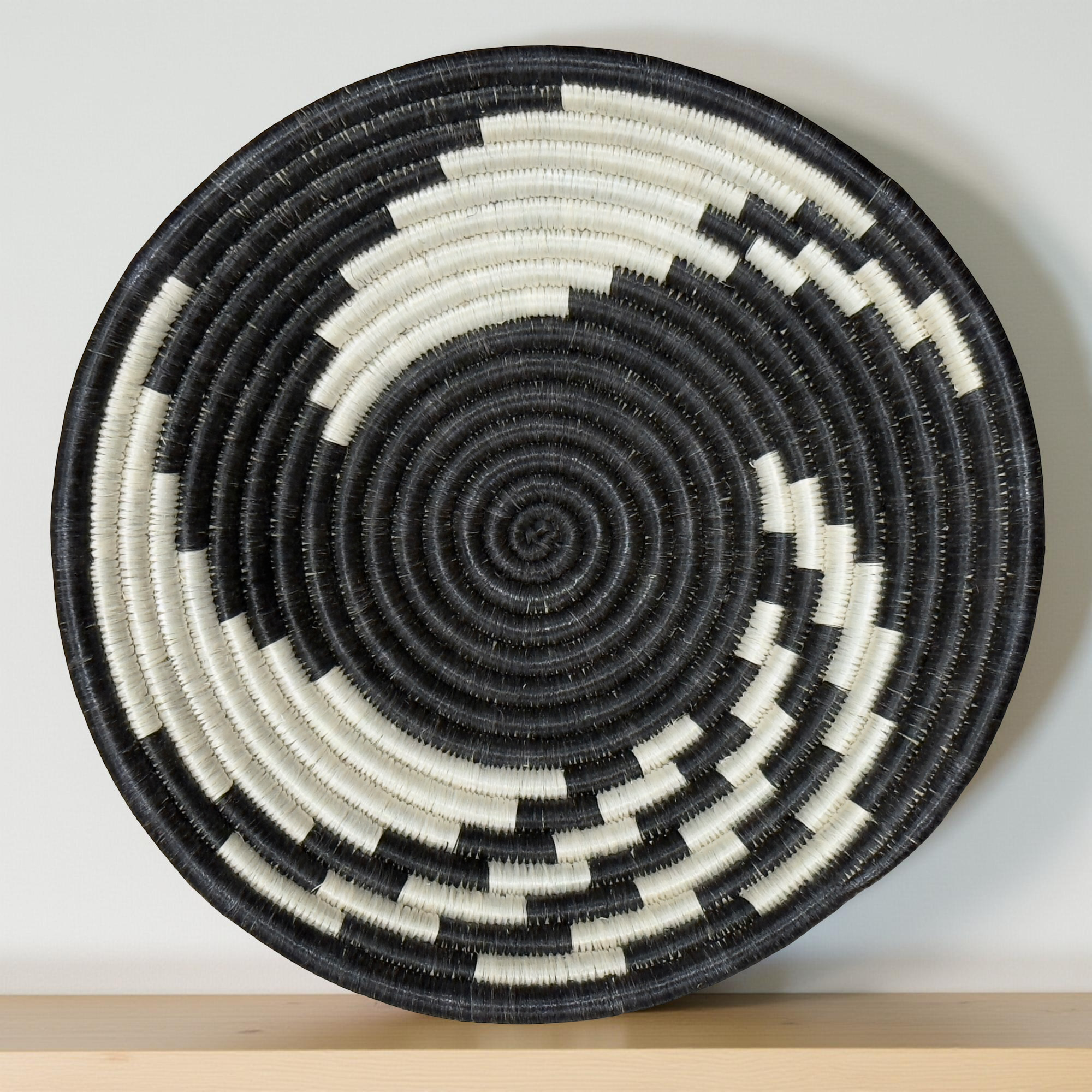 Handwoven Round Sisal basket African Handmade Wall basket decor Hanging decoration Fruit bowl for Home Living room Kitchen Black White Square 12 inches diameter Zen designs arts and crafts
