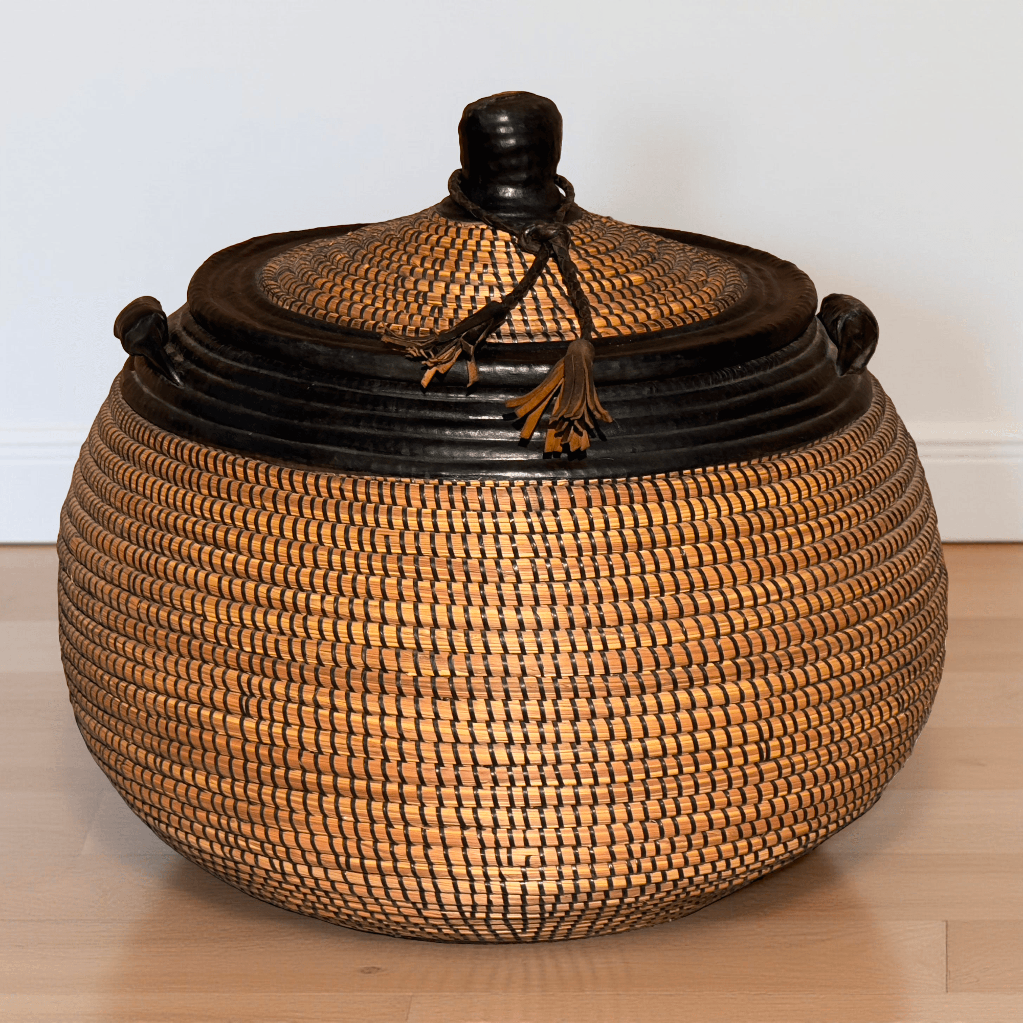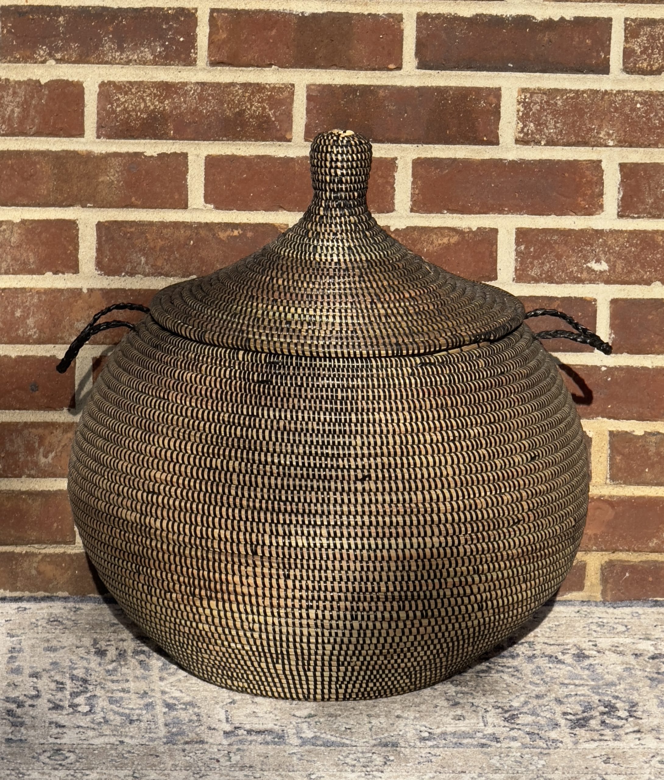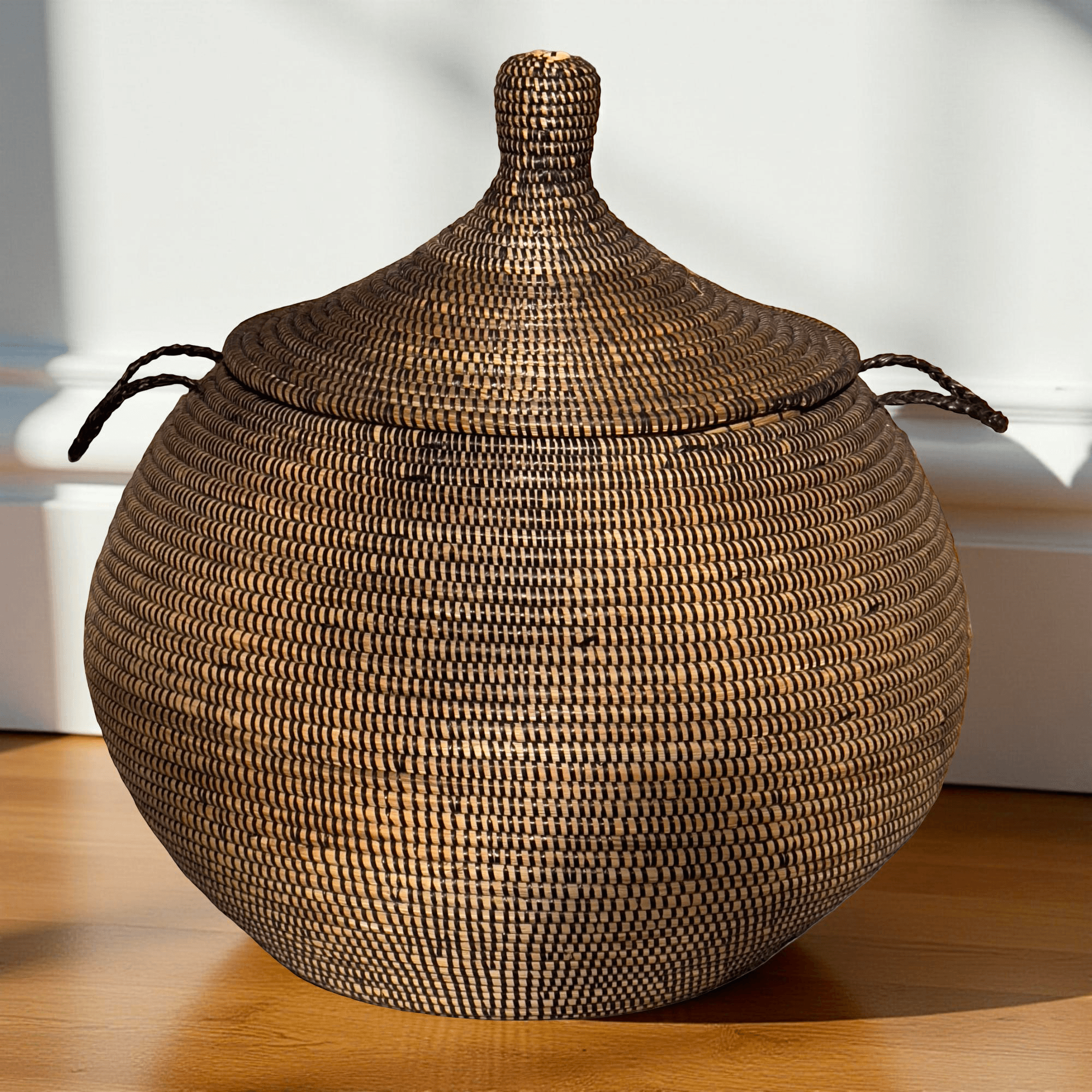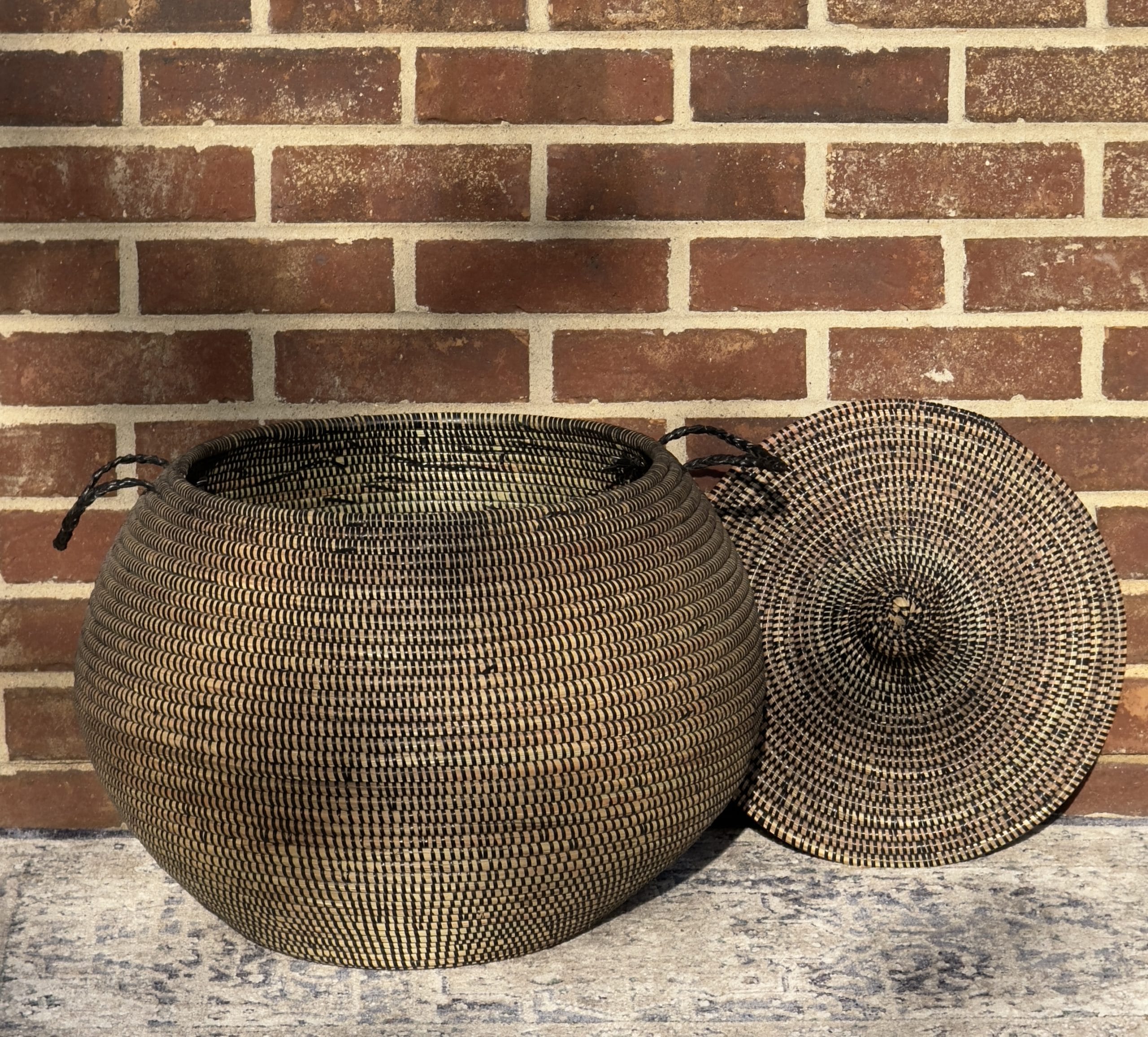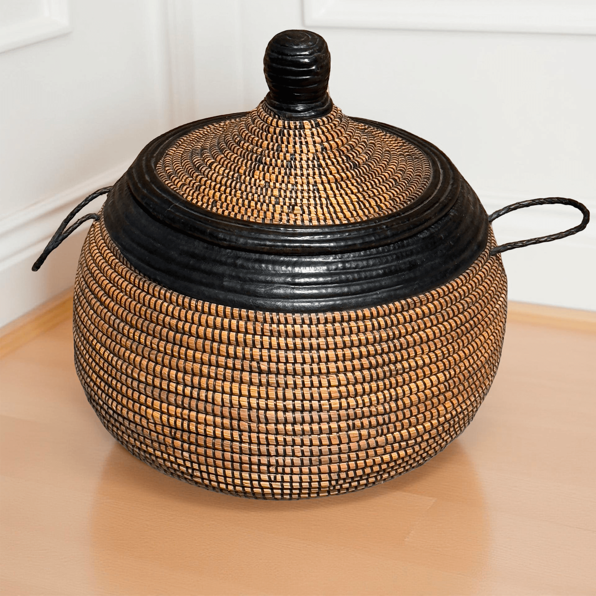 This exquisite Senegalese storage basket is a testament to traditional craftsmanship, blending natural materials with sustainable innovation. Handwoven from durable rice straw, it features striking black accents crafted from recycled plastic strips, adding a modern touch to its rustic charm. The basket is beautifully finished with genuine leather sheep trim, providing both elegance and resilience. Practicality meets artistry with its integrated handle, making it easy to carry. Perfect for adding a touch of global flair to your home, this versatile basket can be used for storage, as a decorative accent, or even as a unique planter.