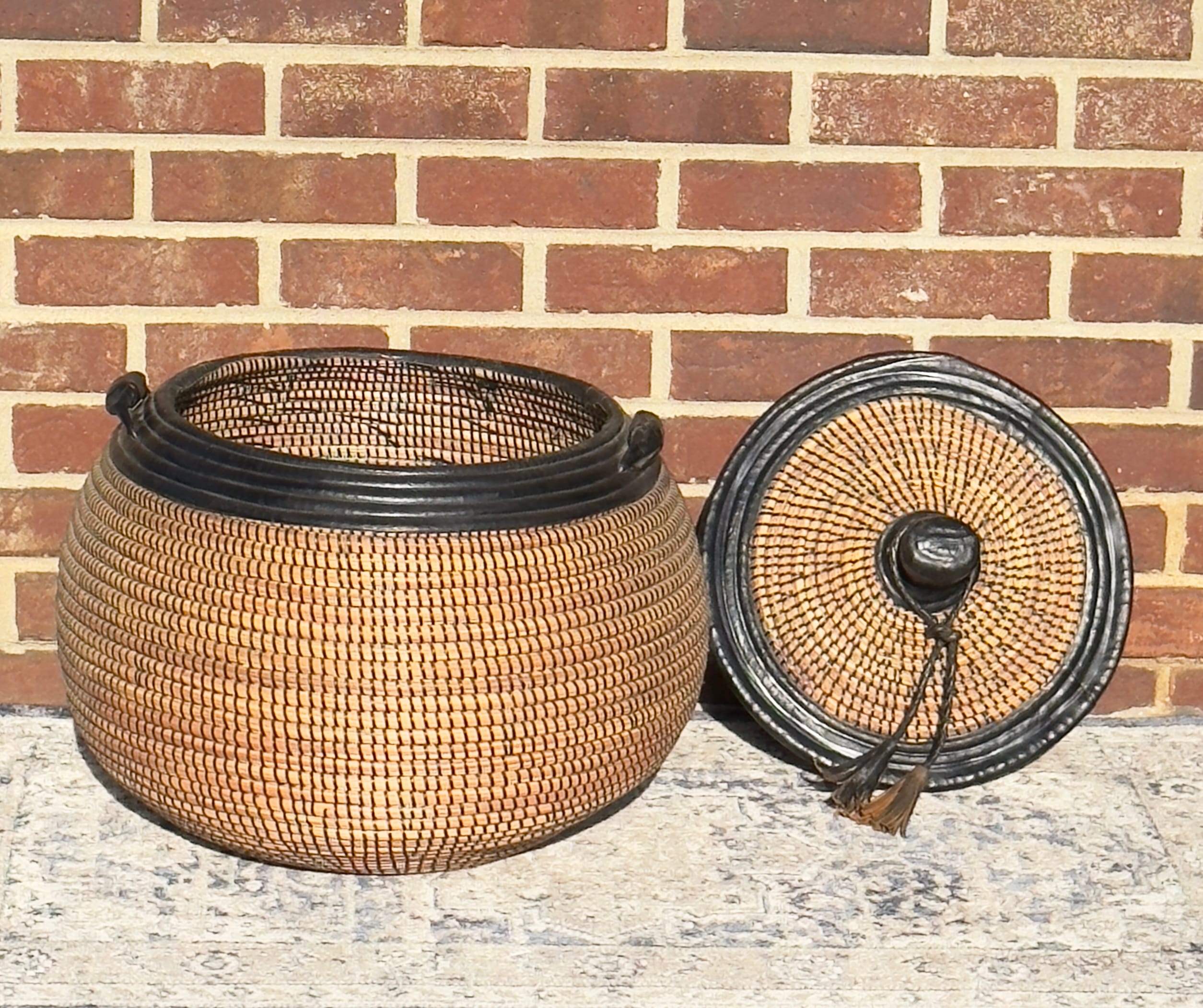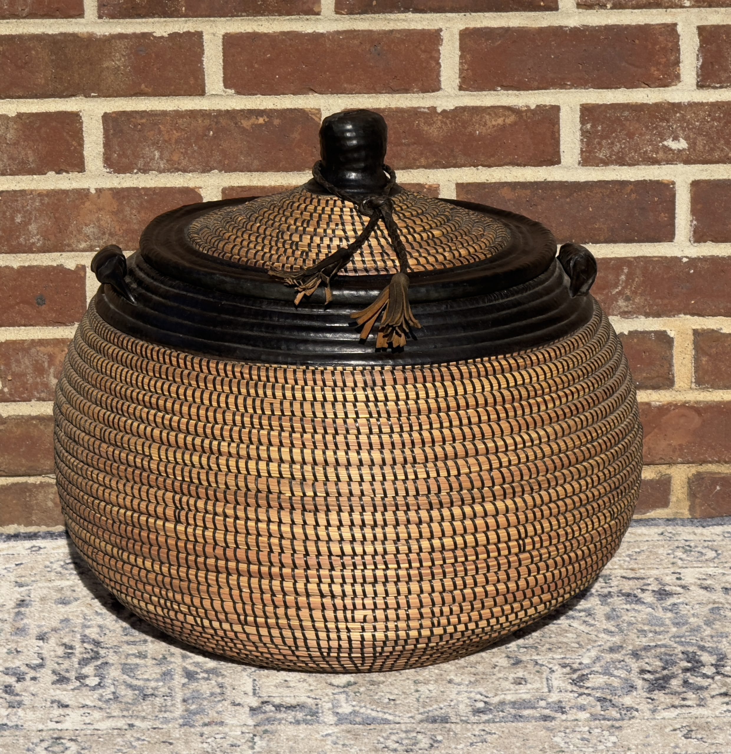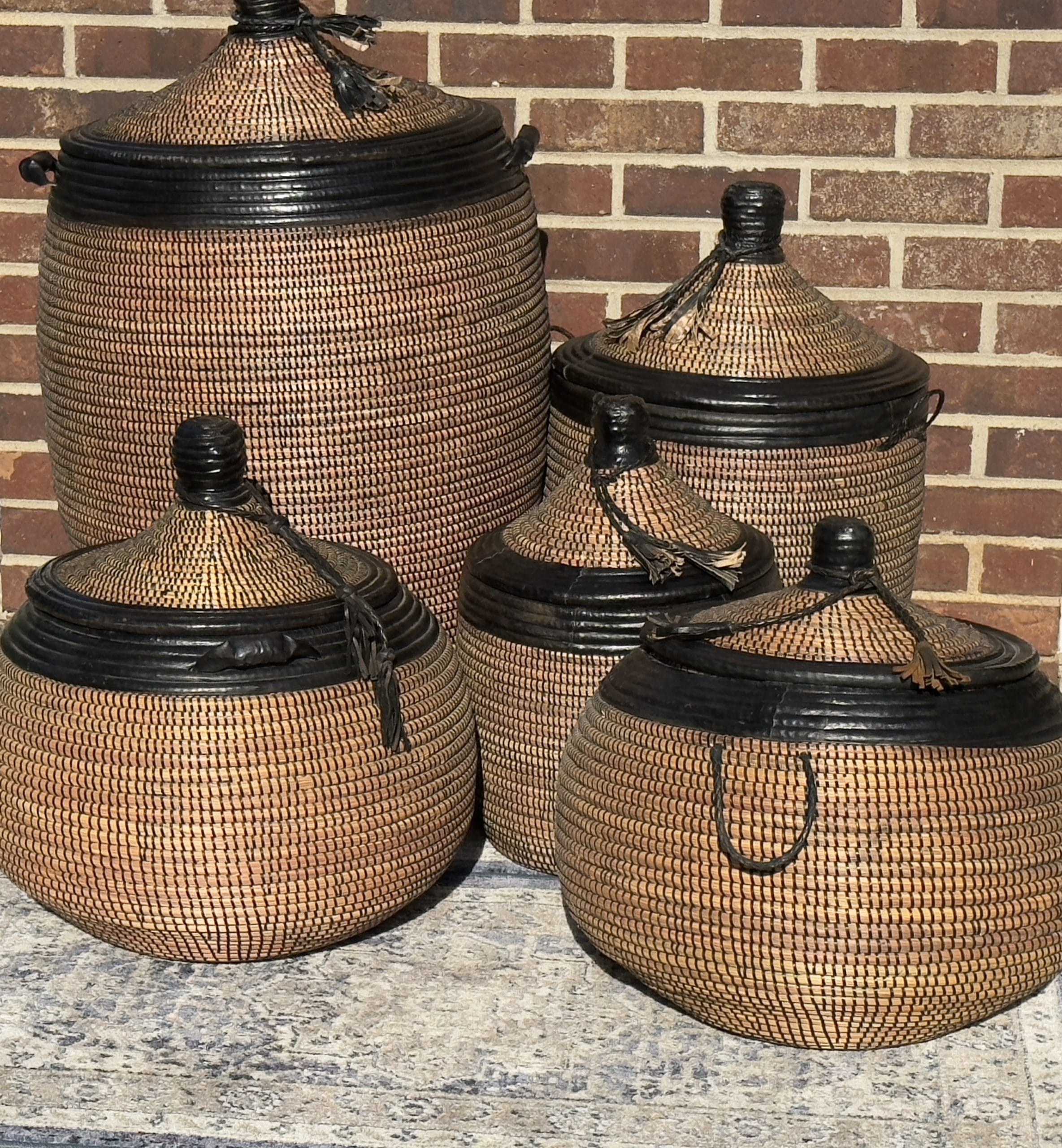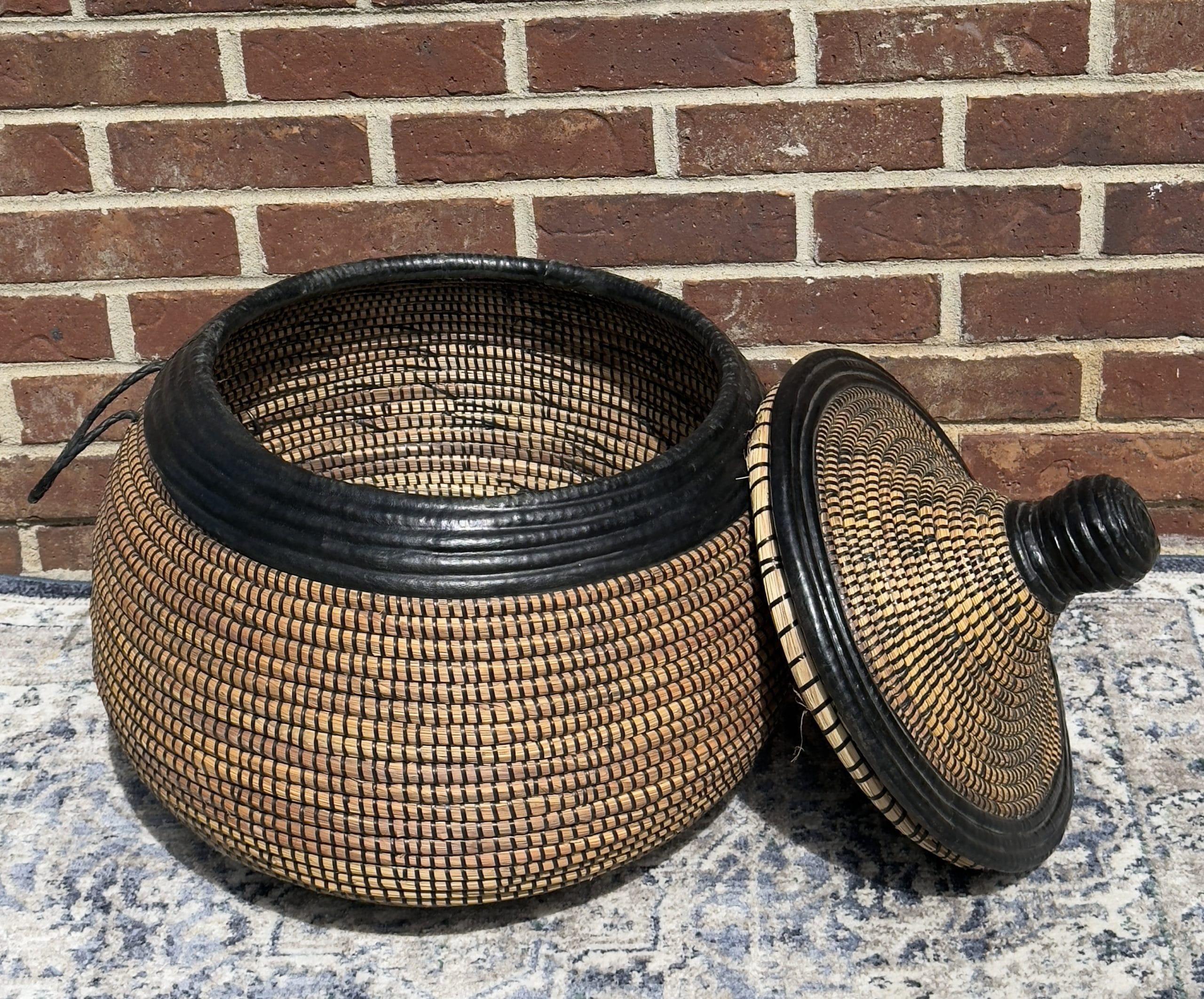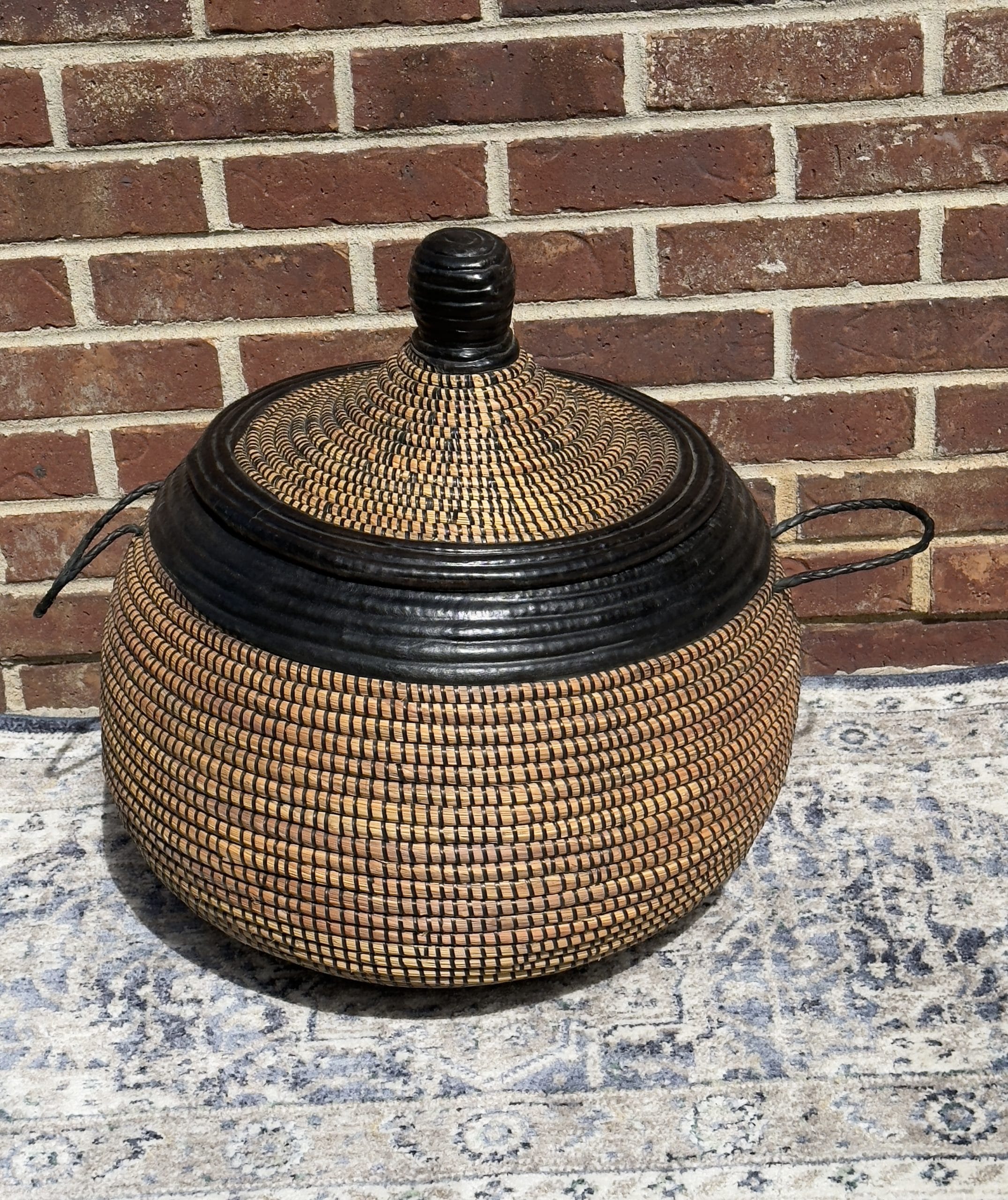 This exquisite Senegalese storage basket is a testament to traditional craftsmanship, blending natural materials with sustainable innovation. Handwoven from durable rice straw, it features striking black accents crafted from recycled plastic strips, adding a modern touch to its rustic charm. The basket is beautifully finished with genuine leather sheep trim, providing both elegance and resilience. Practicality meets artistry with its integrated handle, making it easy to carry. Perfect for adding a touch of global flair to your home, this versatile basket can be used for storage, as a decorative accent, or even as a unique planter.
