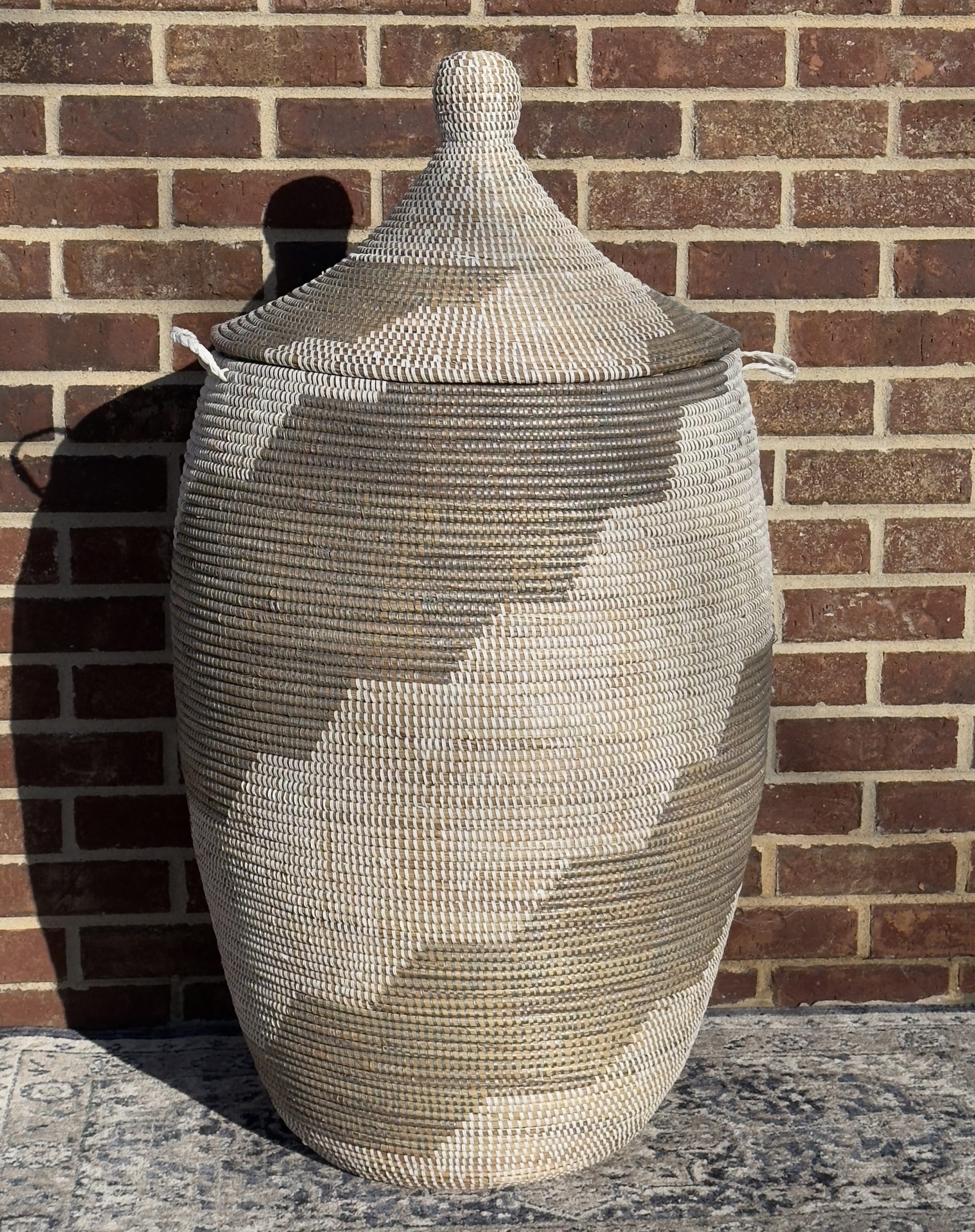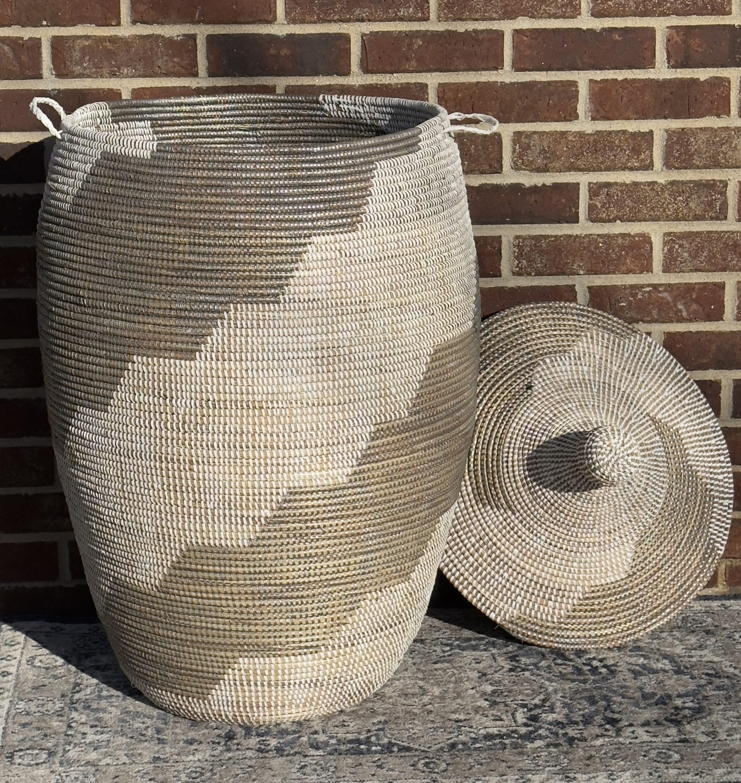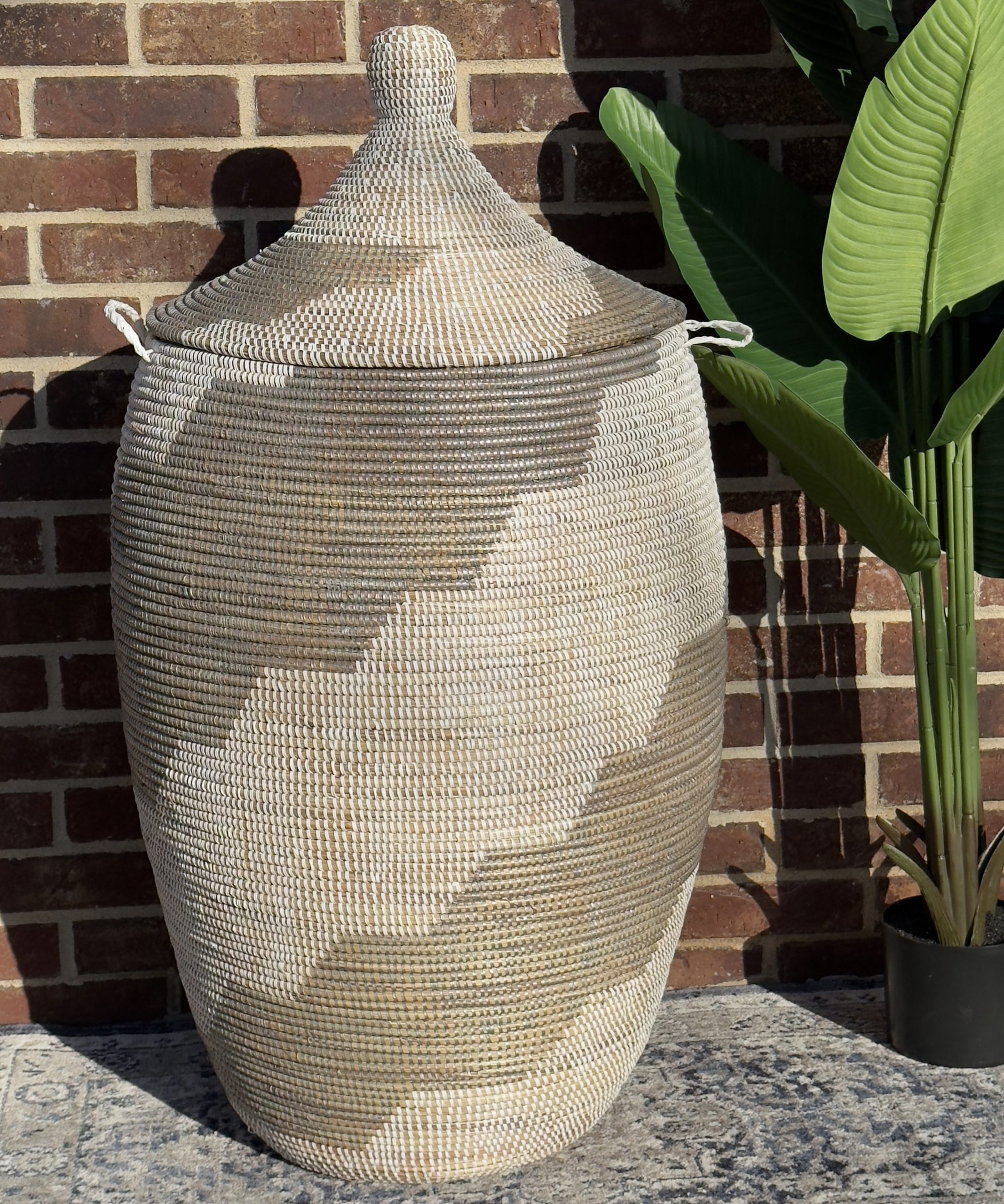 Functioning beautifully as a laundry hamper in your bathroom, a stylish toy basket in a child's room, or an eye-catching storage basket in your living space, its tall and slender silhouette maximizes storage without taking up excessive floor space. The lively silver and white pattern ensures that each basket is a one-of-a-kind creation, a testament to the artisan's individual flair, meaning the colors and patterns you receive will be a delightful surprise.