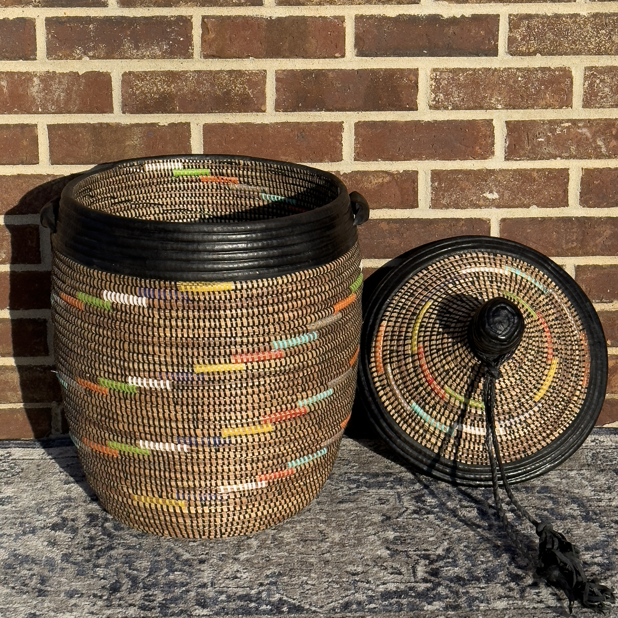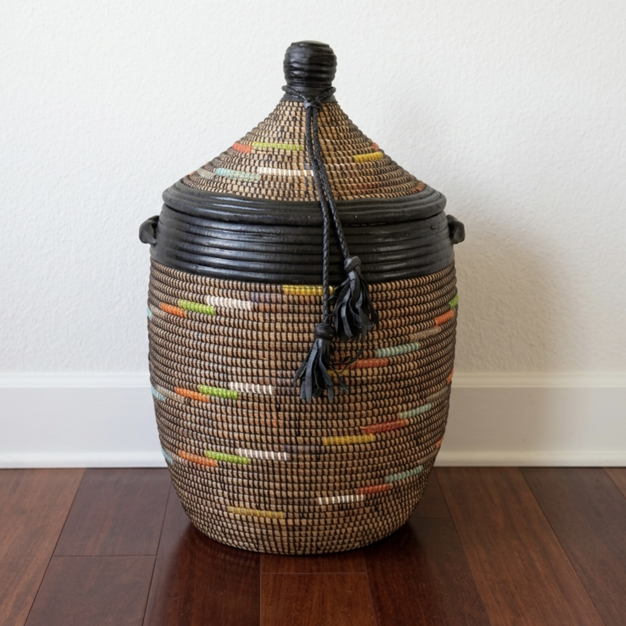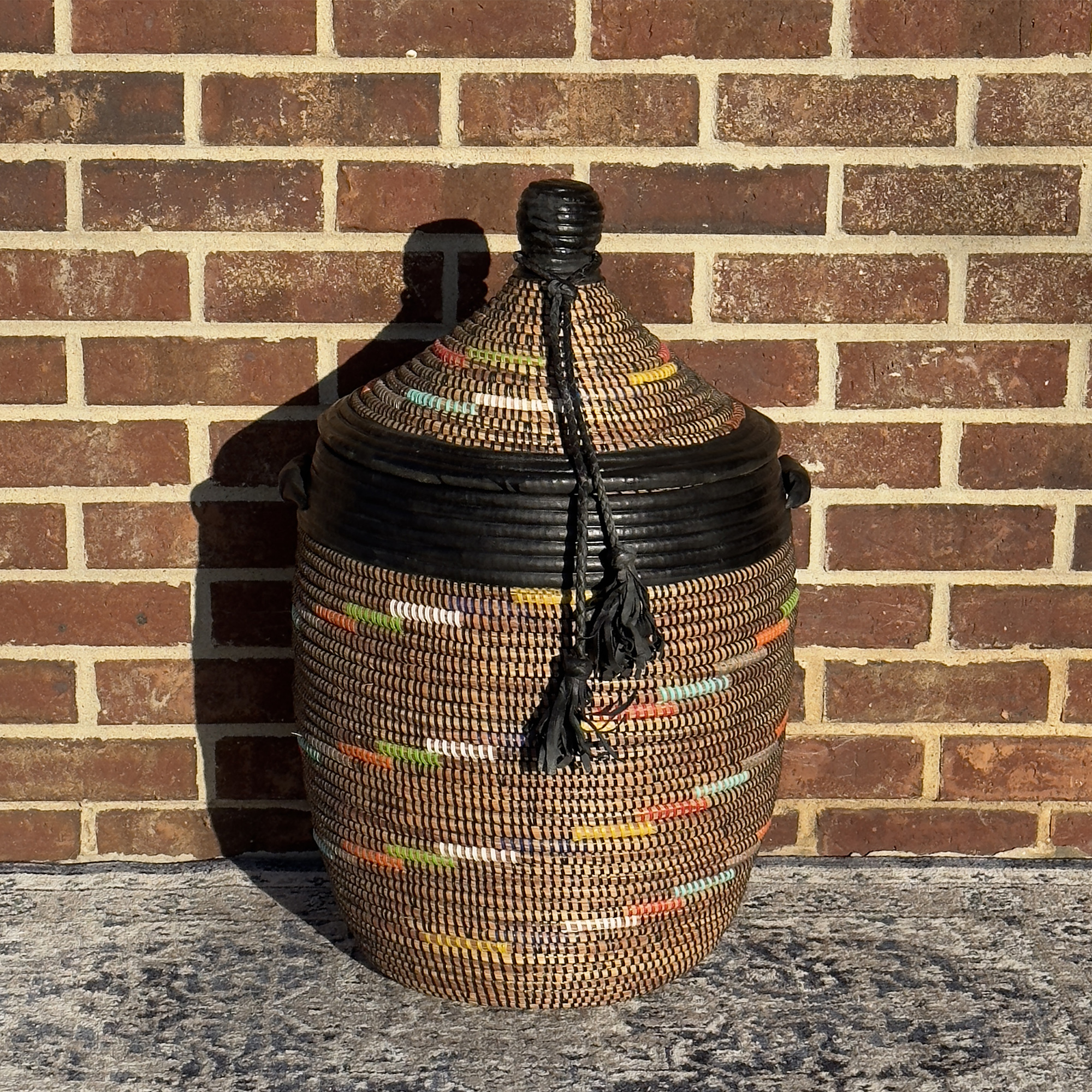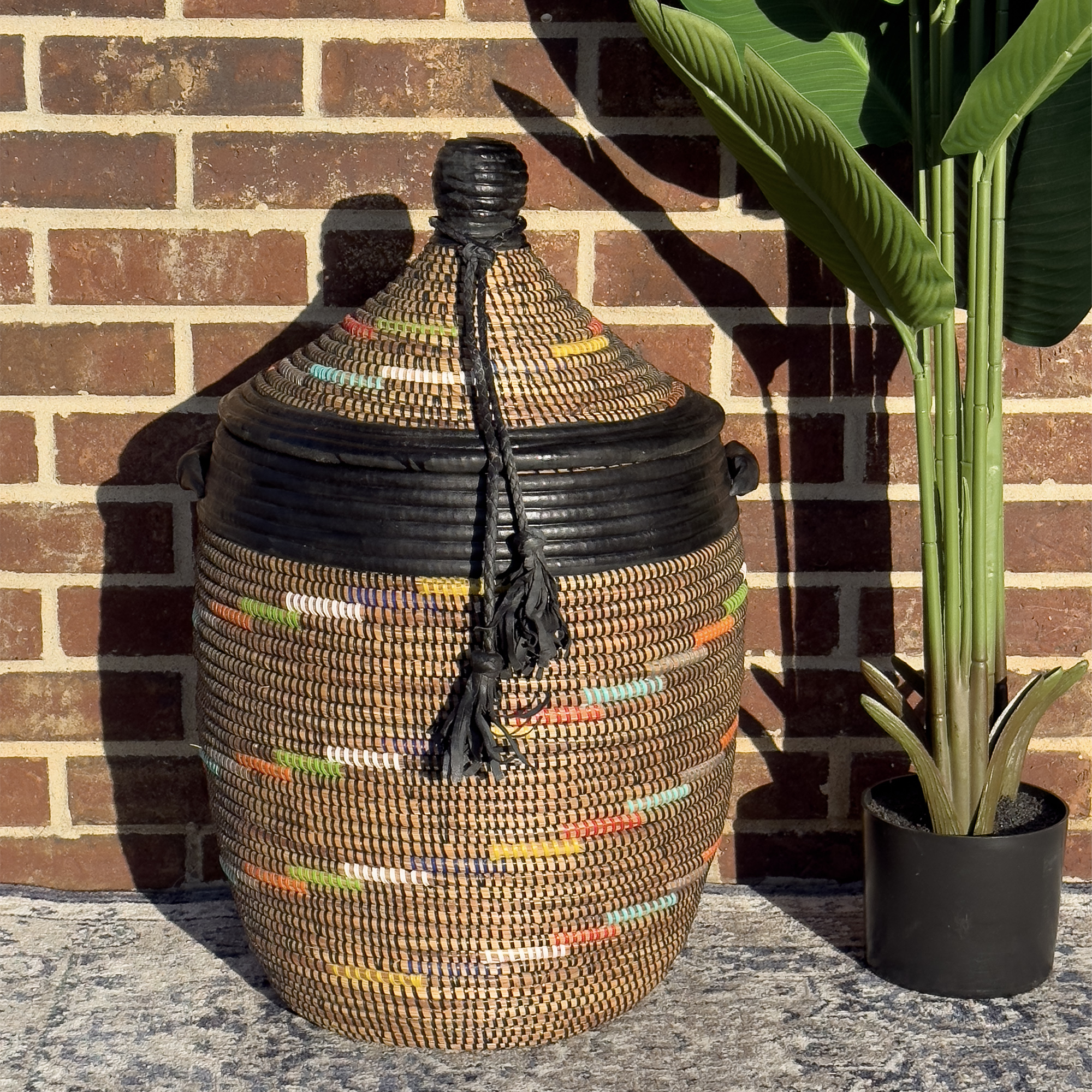 Imagine this striking basket enhancing your home decor, perhaps adding an authentic touch to an Airbnb space. Its robust construction makes it a practical and durable choice for everyday use, while its artistic design elevates it beyond mere utility. By choosing this Senegalese woven basket, you're not only acquiring a beautiful and functional item but also supporting the livelihoods and traditions of talented craftswomen in Africa. Please note that due to the handmade nature of this product and the natural variations in materials, slight differences in dimensions and appearance are to be expected, adding to its unique charm.