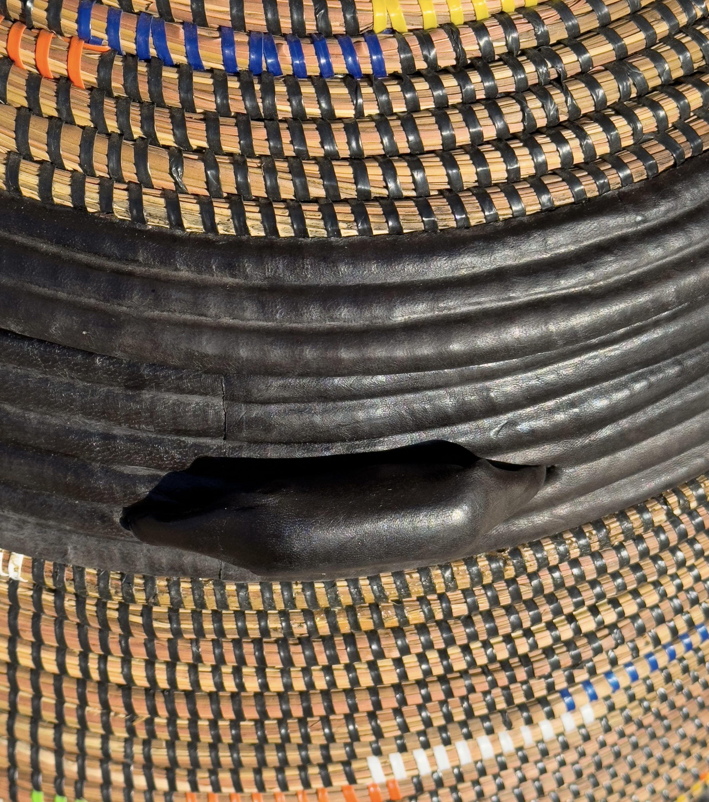 Handcrafted from: Rice straw, repurposed plastic, sheep leather