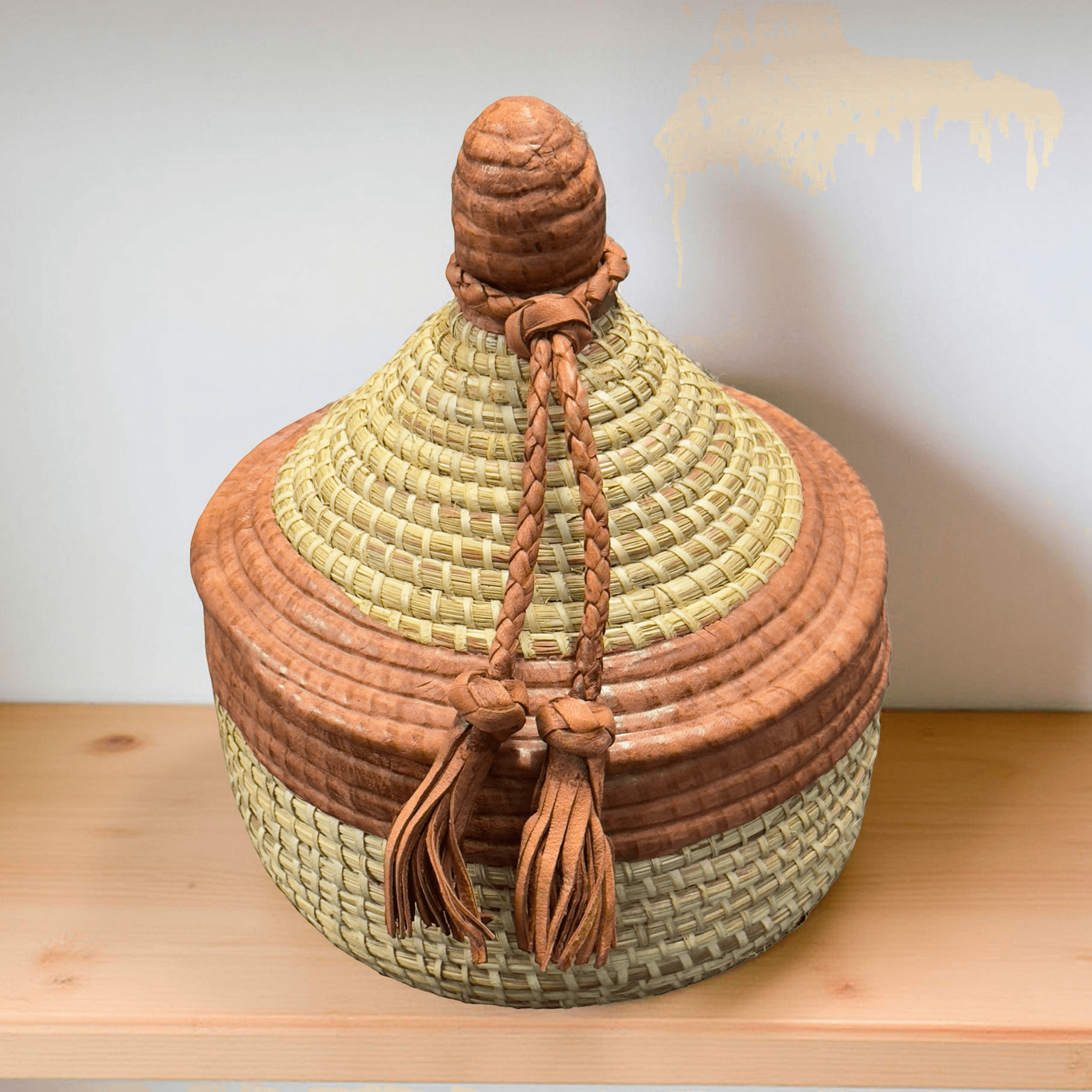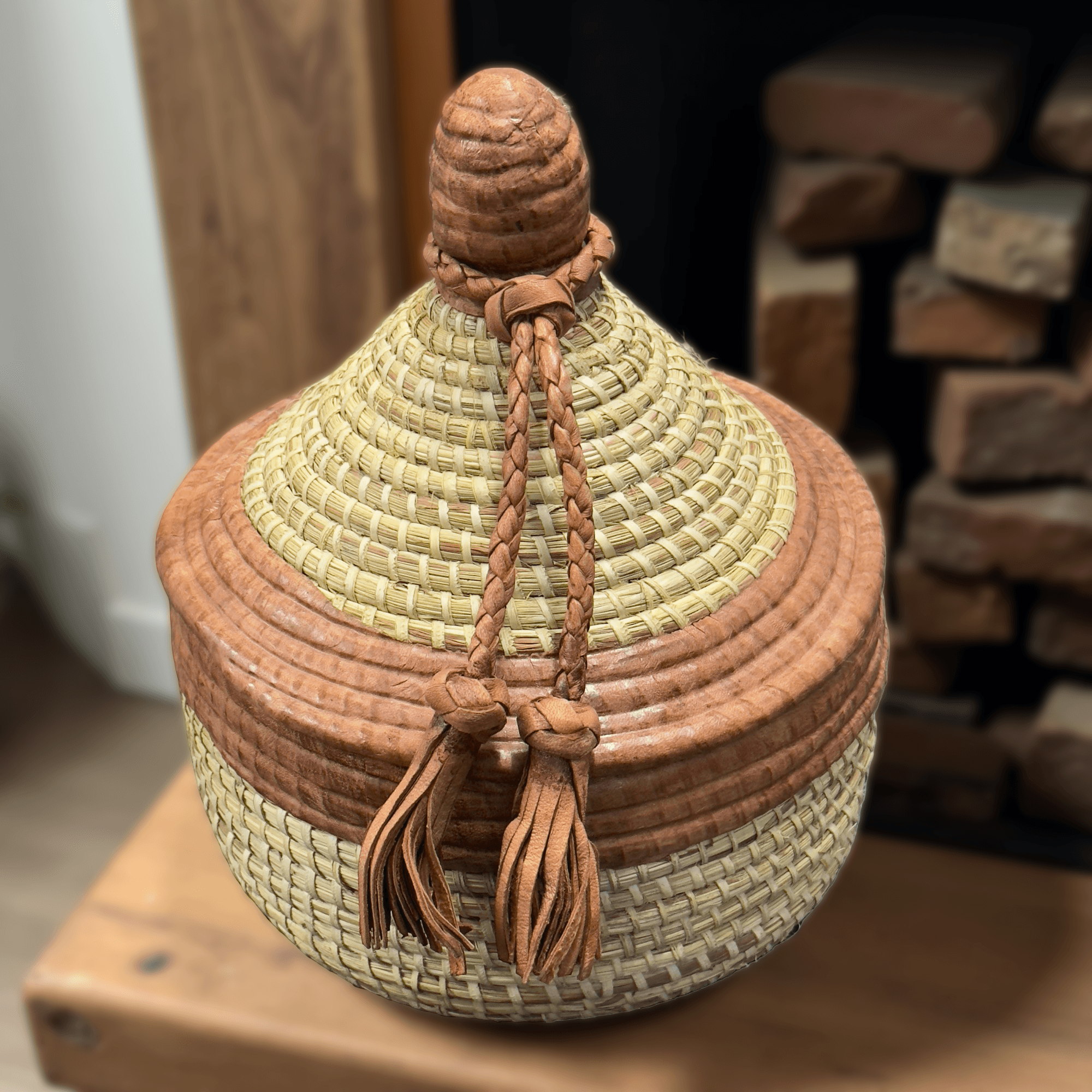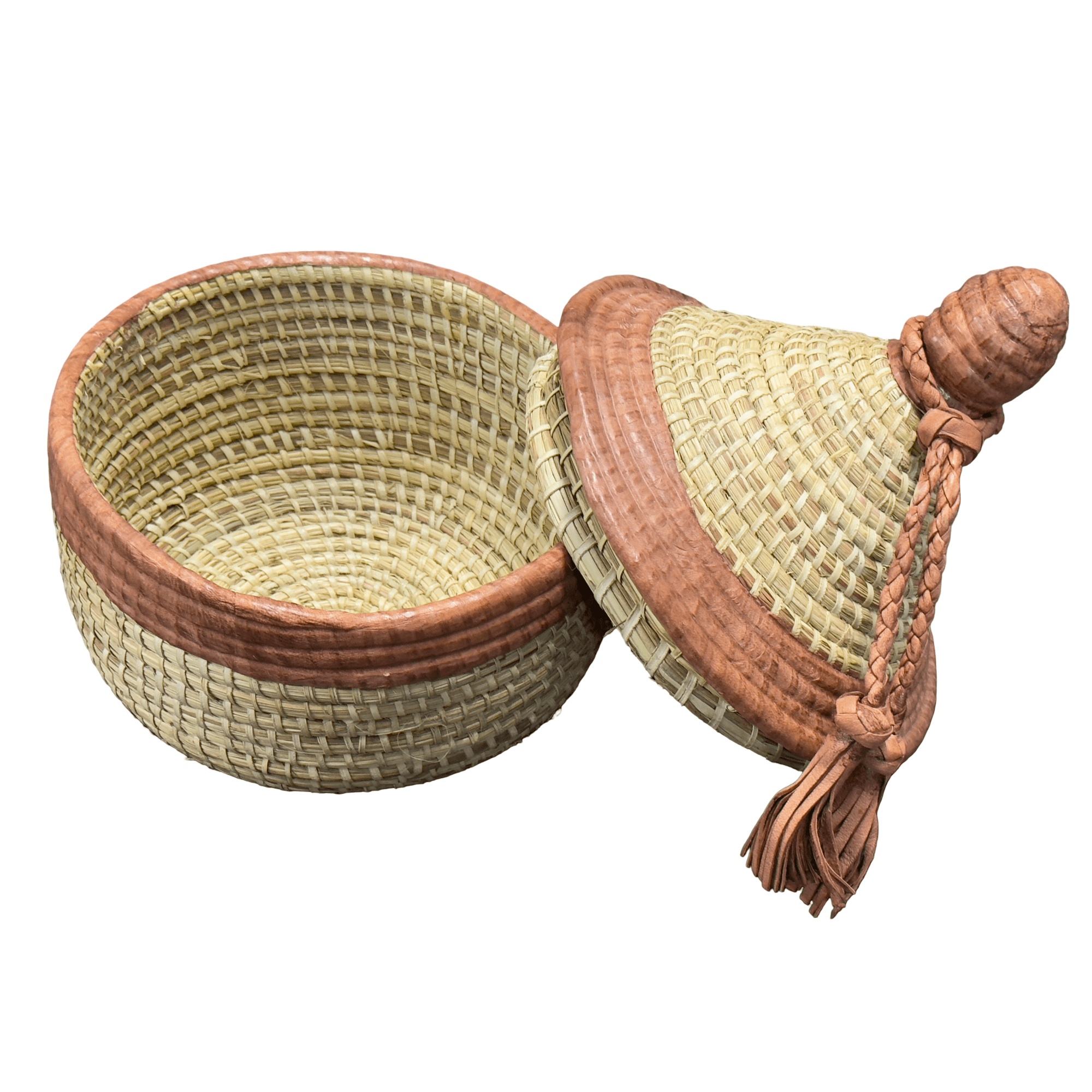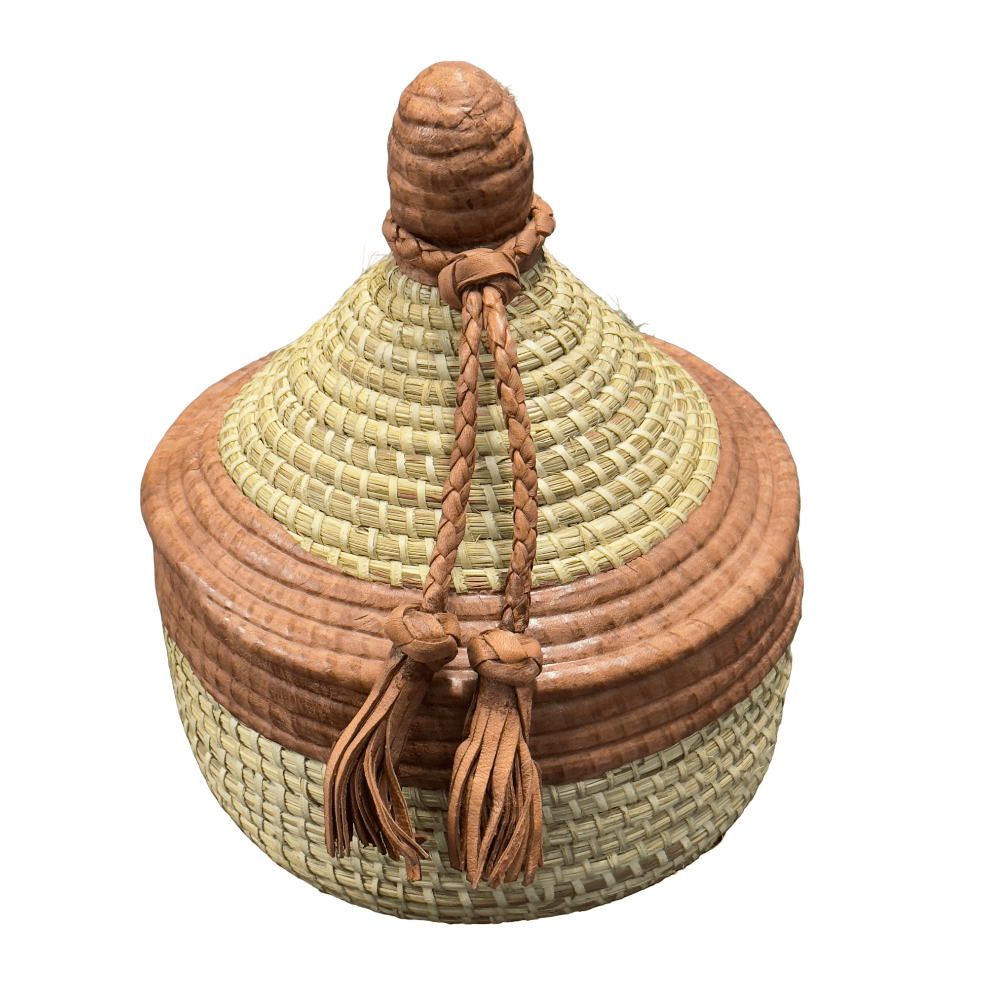 Vintage Small Lidded Senegalese Basket, Ideal for Organizing Small Items in Natural and Leather Trimmed