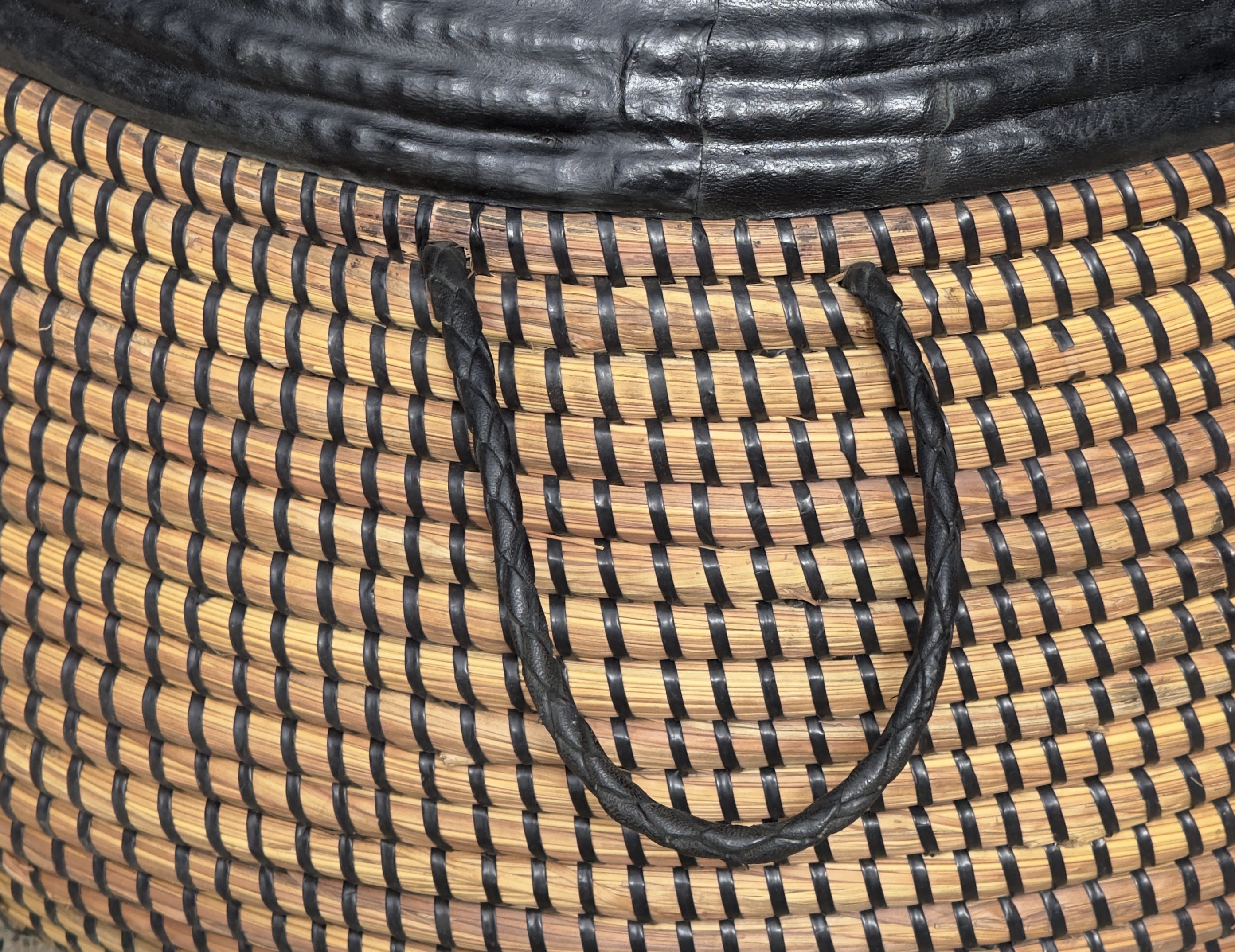 Handcrafted from: Rice straw, repurposed plastic, sheep leather